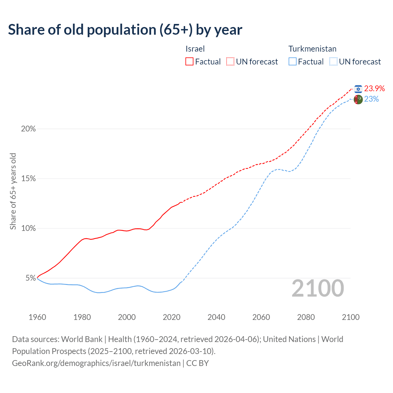 The share of older people aged 65 and over is 12.6% in Israel and 4.53% in Turkmenistan. Life expectancy in Israel compared to Turkmenistan .
