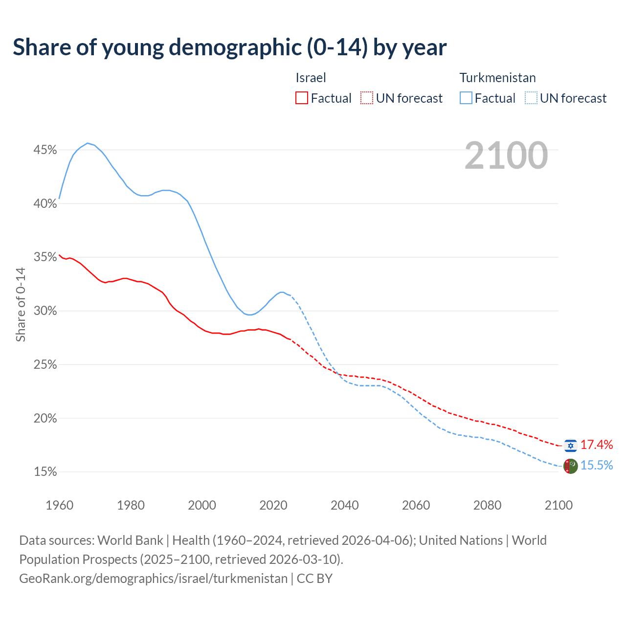 - The share of young demographic (0-15 years old) in Israel is 27.4% vs 31.5% in Turkmenistan.