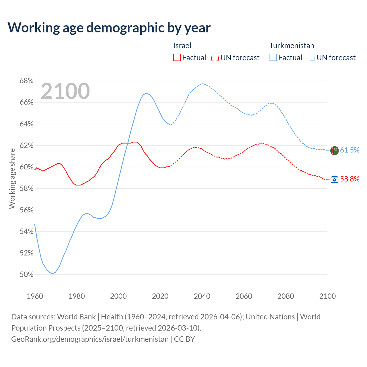 - Israel has 6.18M working age adults (aged 15-64) vs 4.97M in Turkmenistan.