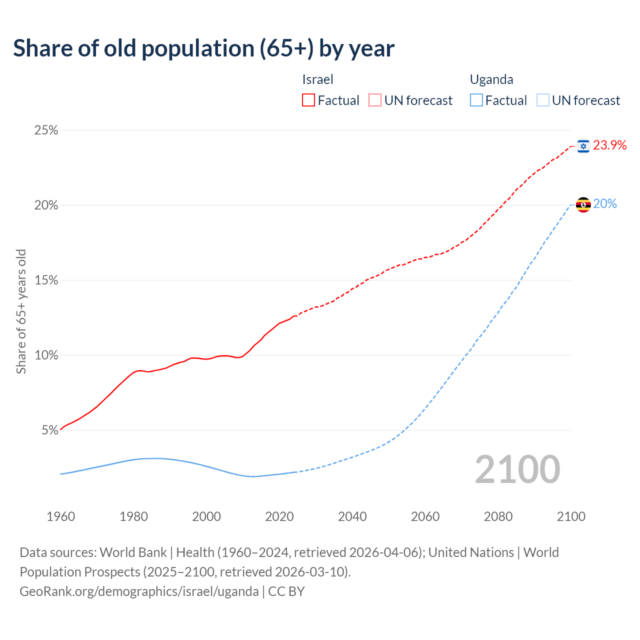 The share of older people aged 65 and over is 12.6% in Israel and 2.19% in Uganda. Life expectancy in Israel compared to Uganda .