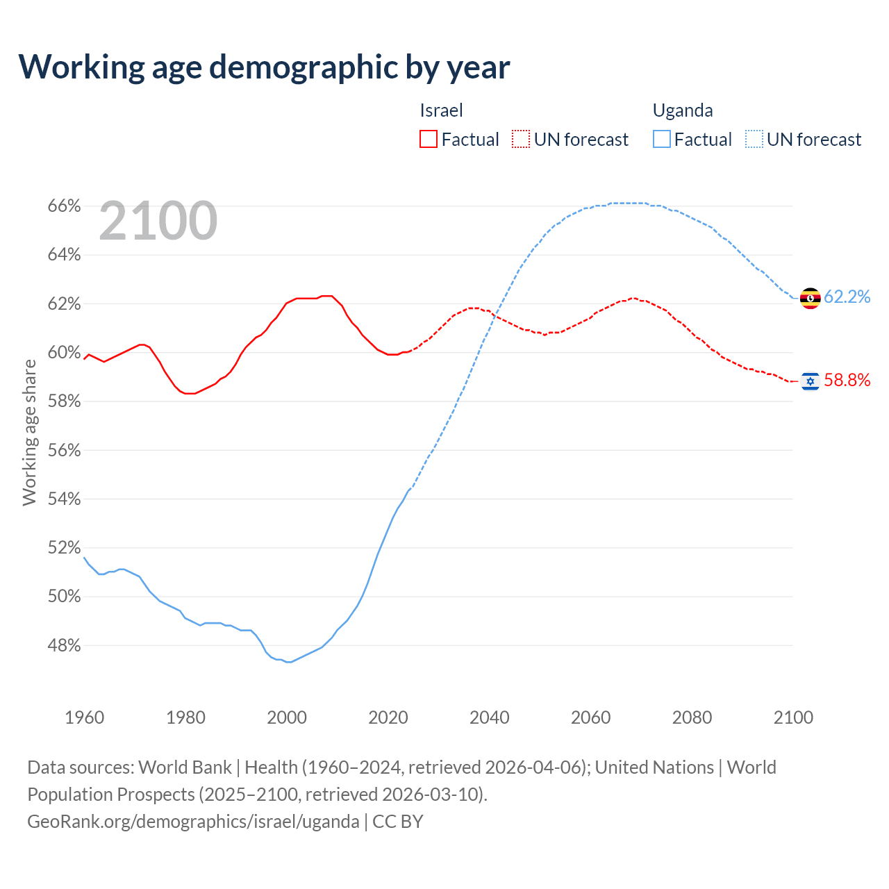 Median age Israel vs Uganda, 1960-2100