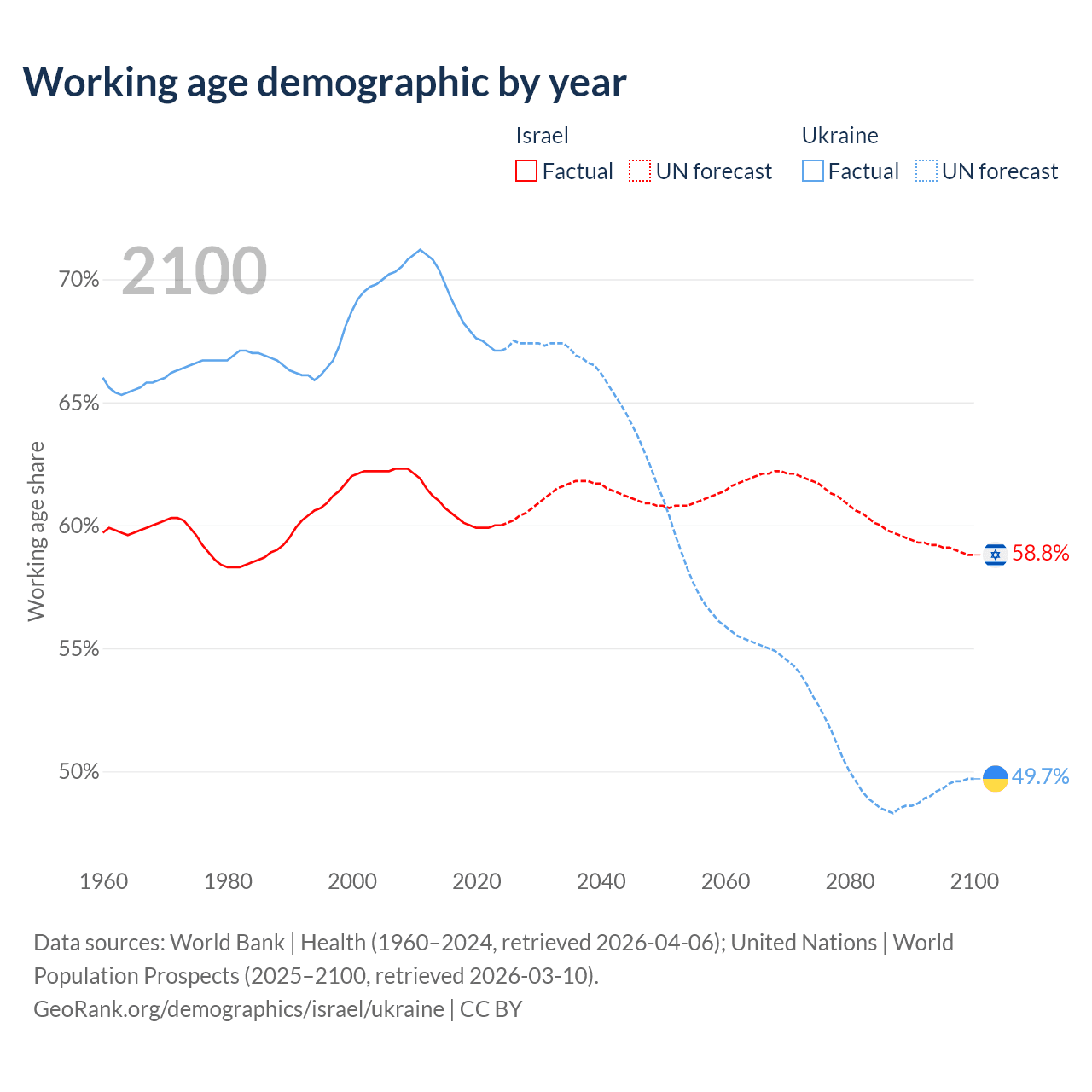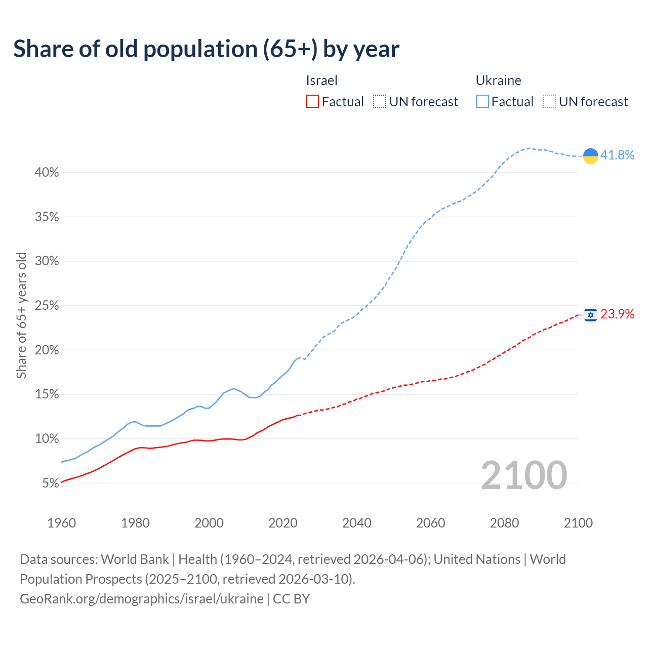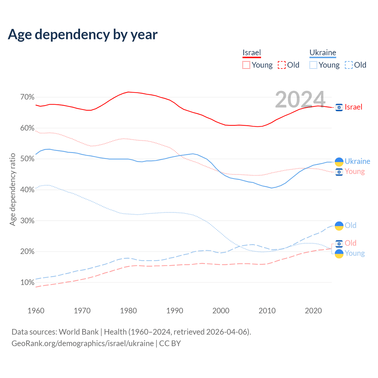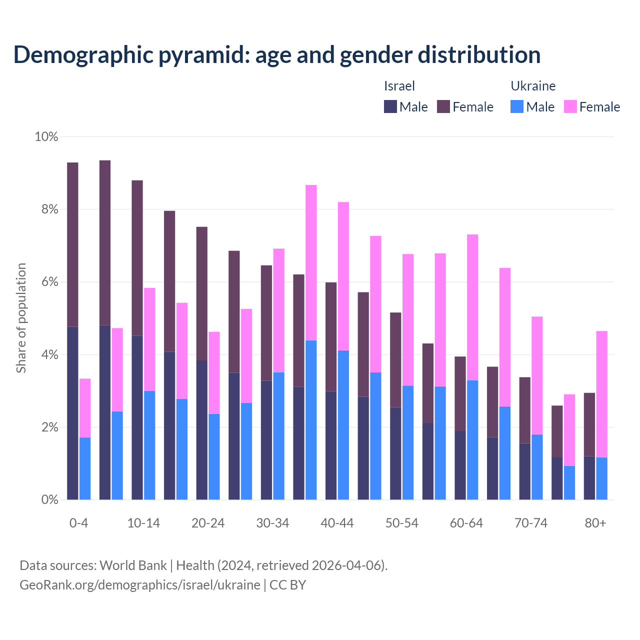 - Israel is ranked 103/196 by median age (oldest to youngest) vs 26/196 for Ukraine.