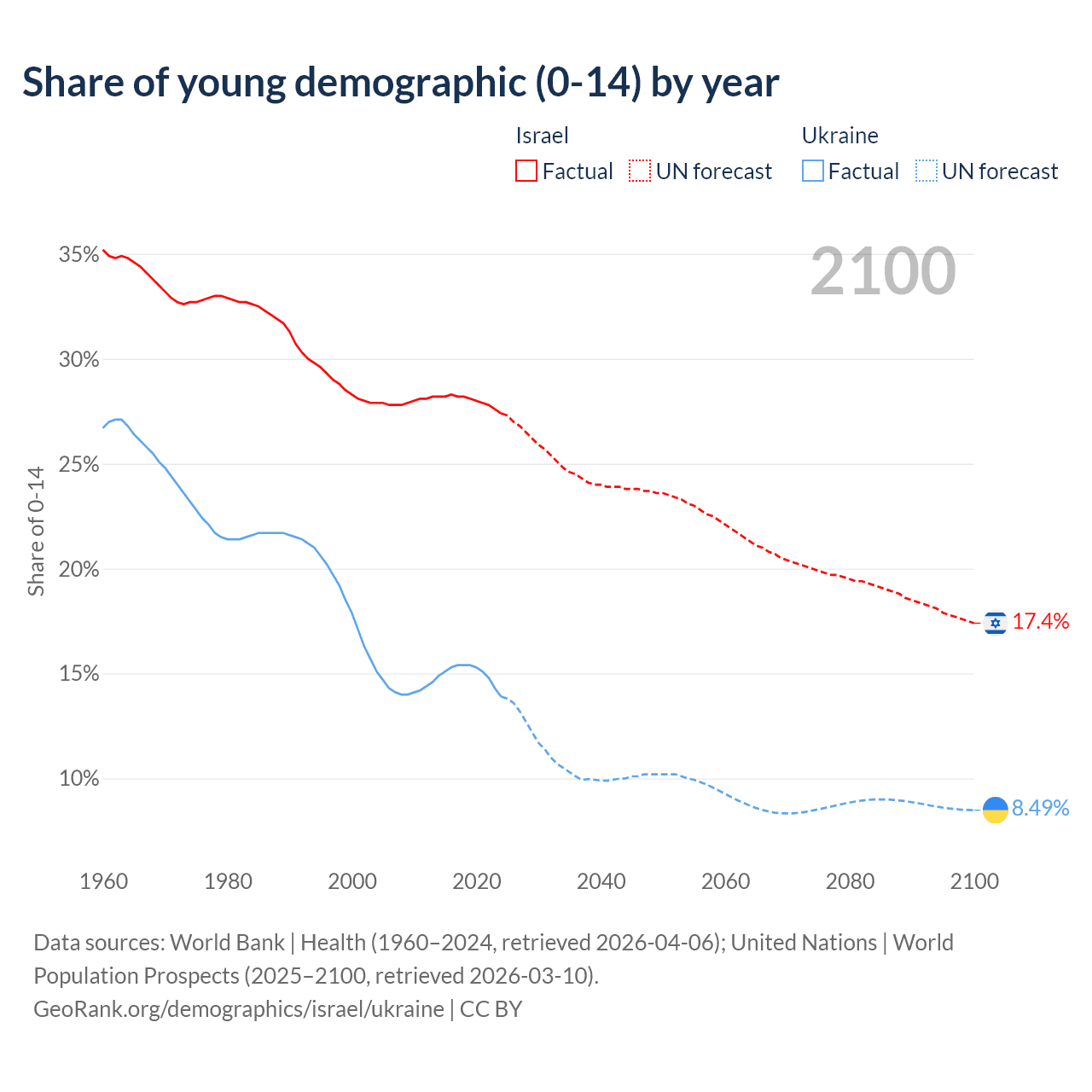 - The total fertility rate is 2.85 in Israel compared to 0.98 in Ukraine.