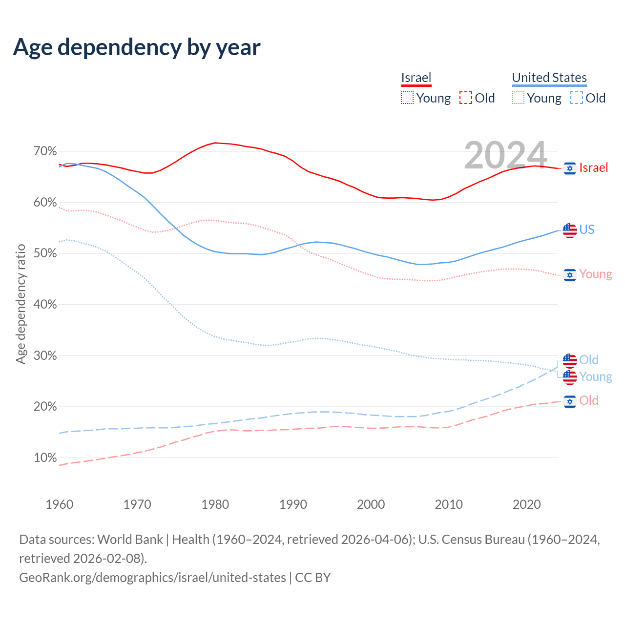 - Israel is ranked 103/196 by median age (oldest to youngest) vs 50/196 for the United States.
