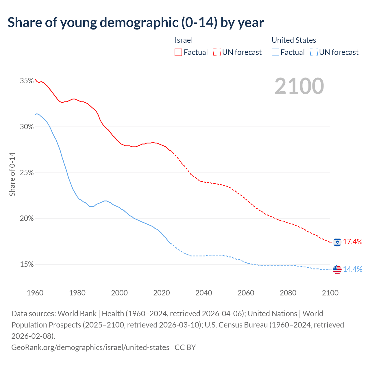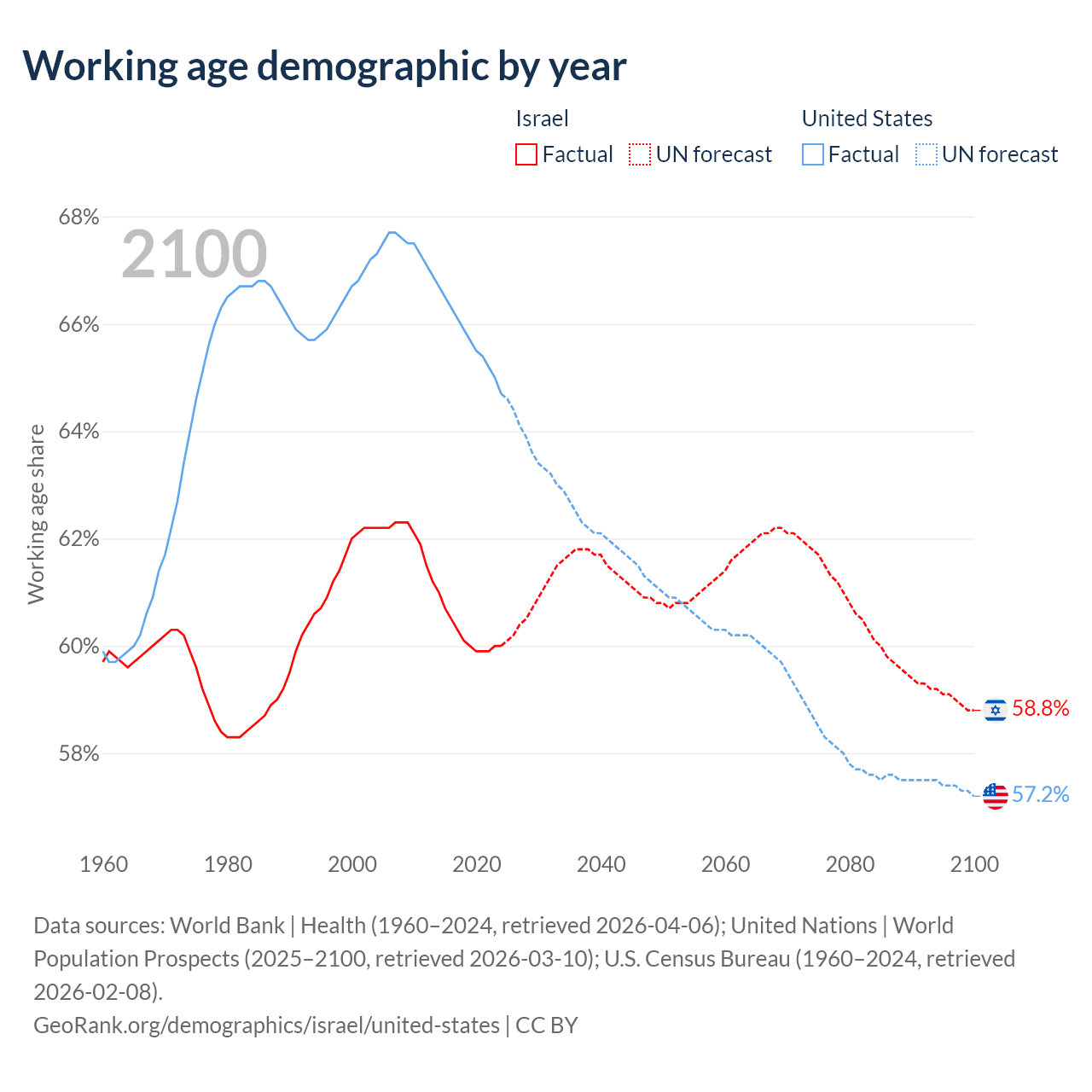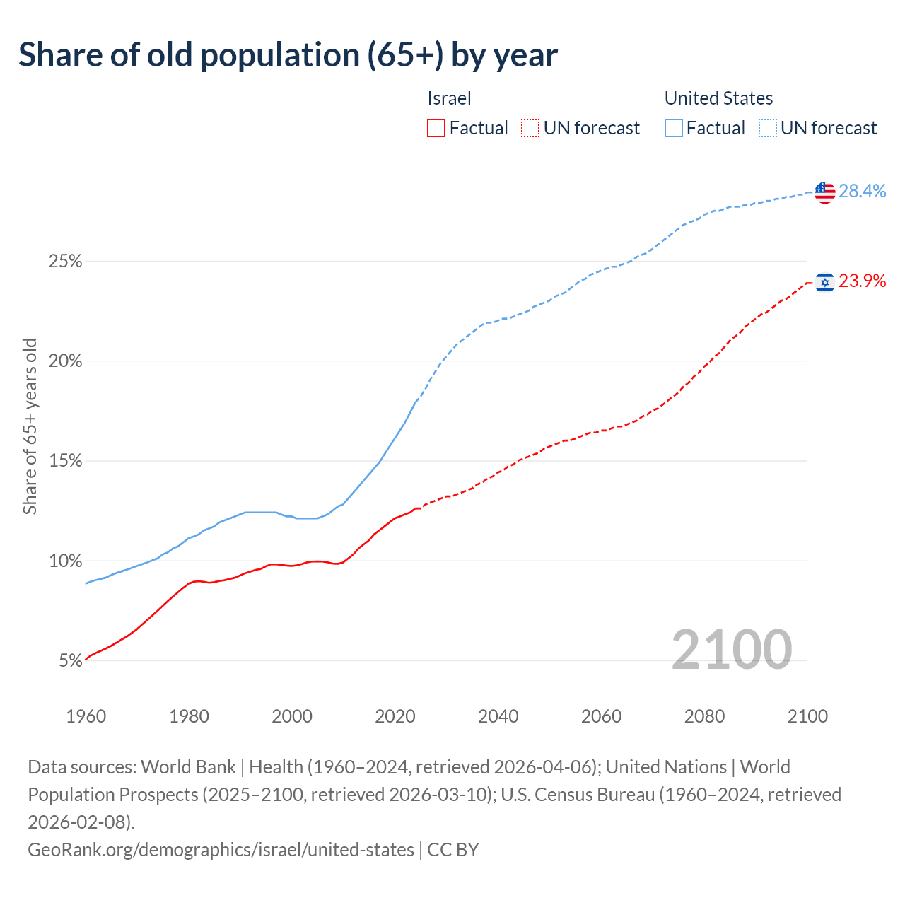 Median age Israel vs United States, 1960-2100