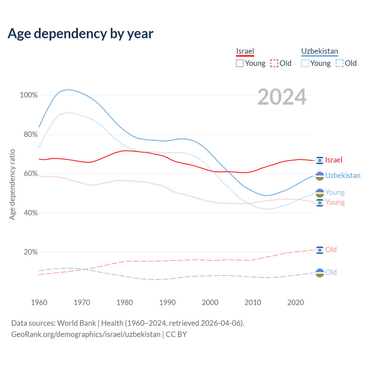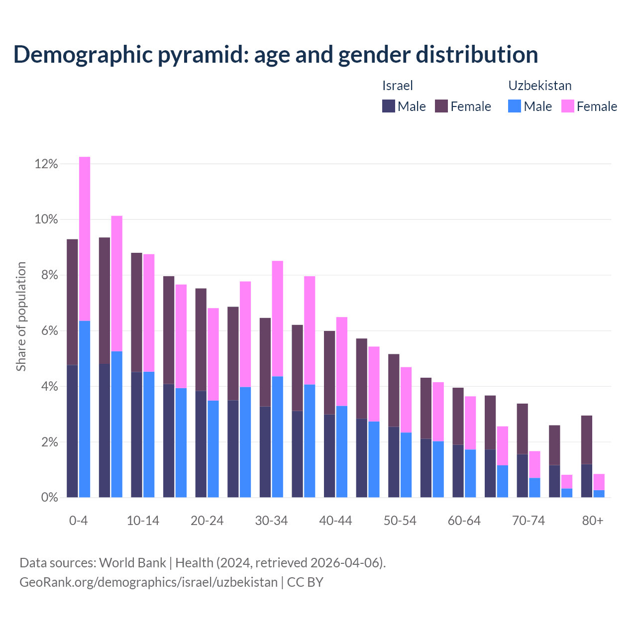 - Israel is ranked 103/196 by median age (oldest to youngest) vs 116/196 for Uzbekistan.