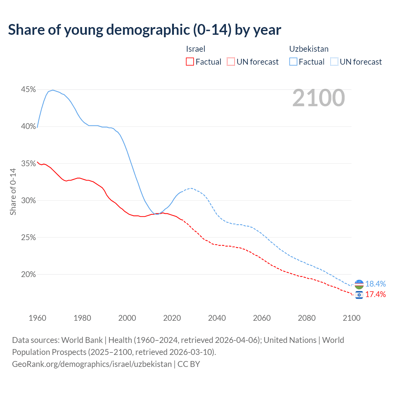 - The share of young demographic (0-15 years old) in Israel is 27.4% vs 31.1% in Uzbekistan.