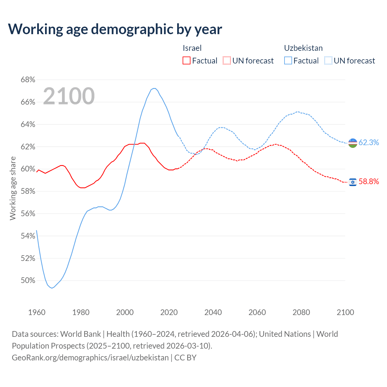 - Israel has 6.18M working age adults (aged 15-64) vs 23.9M in Uzbekistan.
