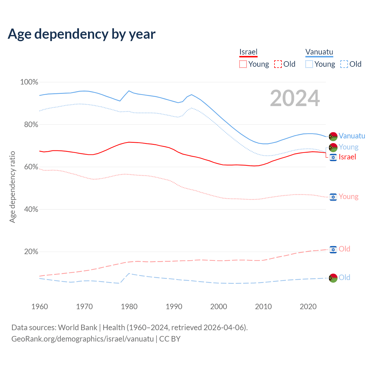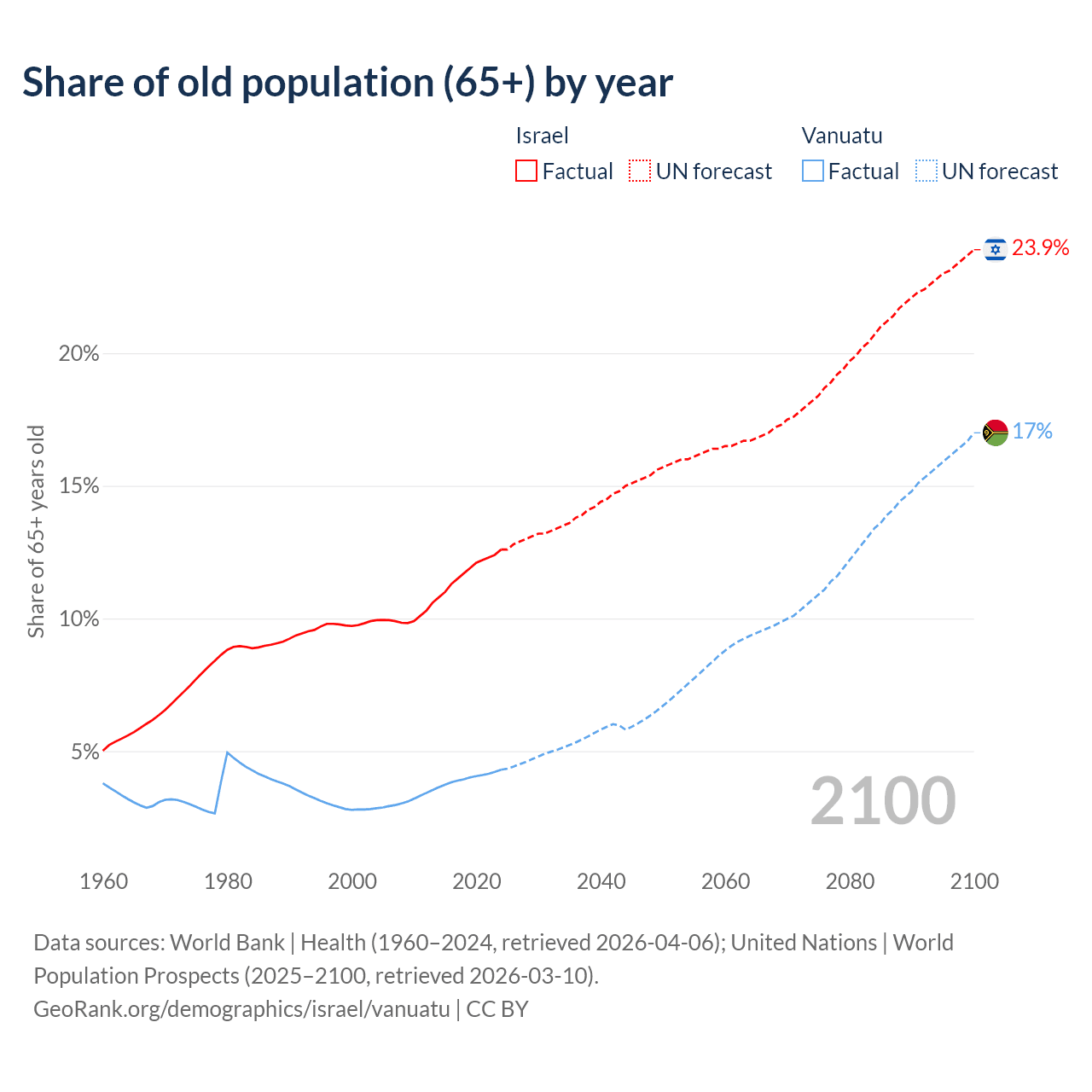 The share of older people aged 65 and over is 12.6% in Israel and 4.3% in Vanuatu. Life expectancy in Israel compared to Vanuatu .