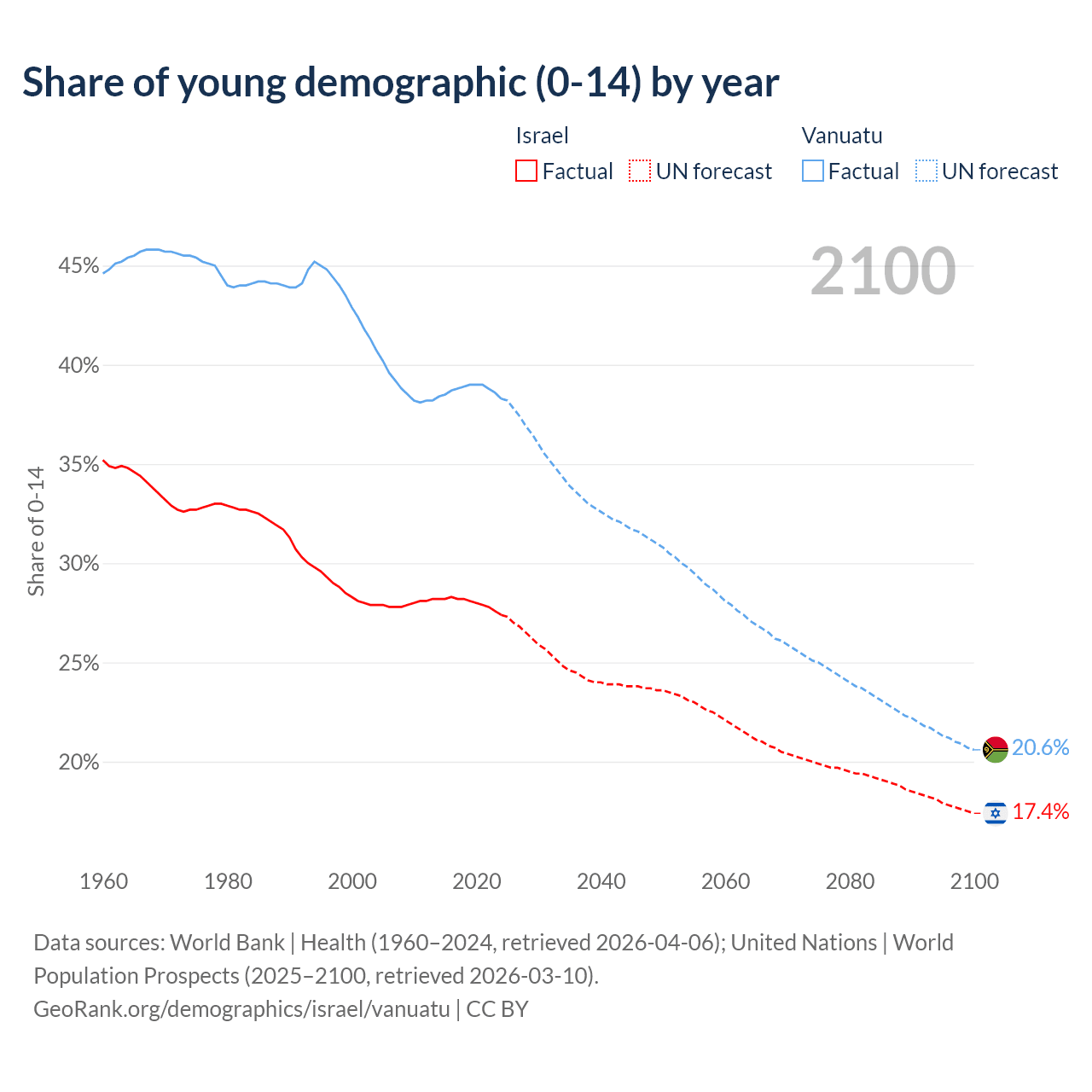 Median age Israel vs Vanuatu, 1960-2100