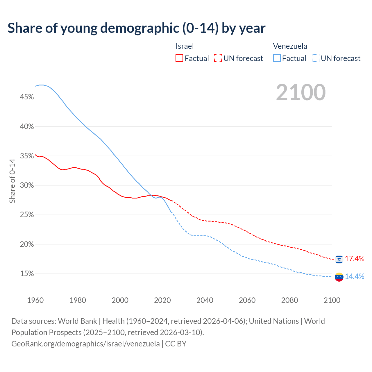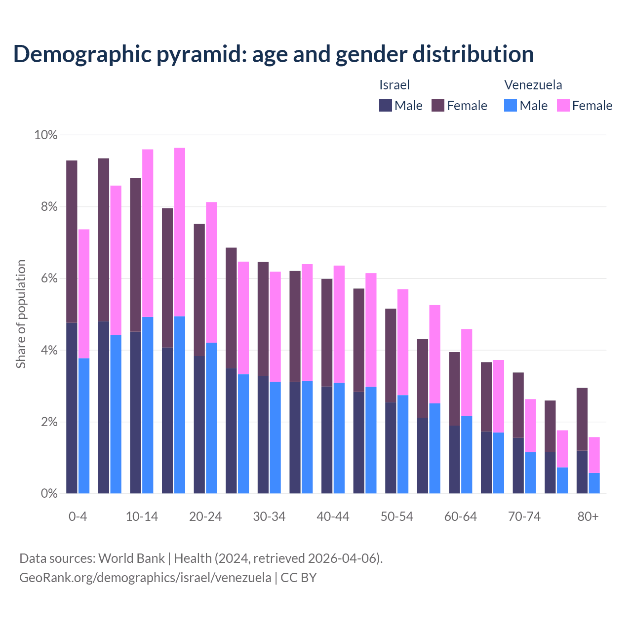 - Israel is ranked 103/196 by median age (oldest to youngest) vs 104/196 for Venezuela.