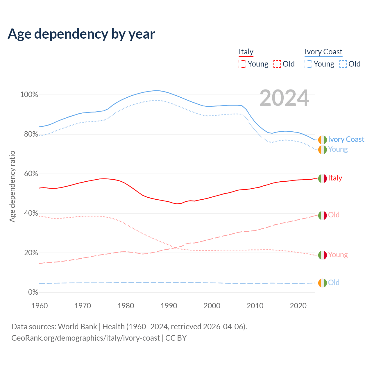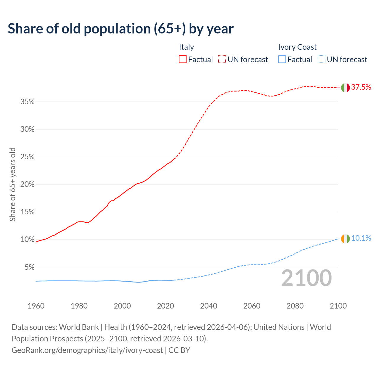 The share of older people aged 65 and over is 24.6% in Italy and 2.61% in Ivory Coast. Life expectancy in Italy compared to Ivory Coast .