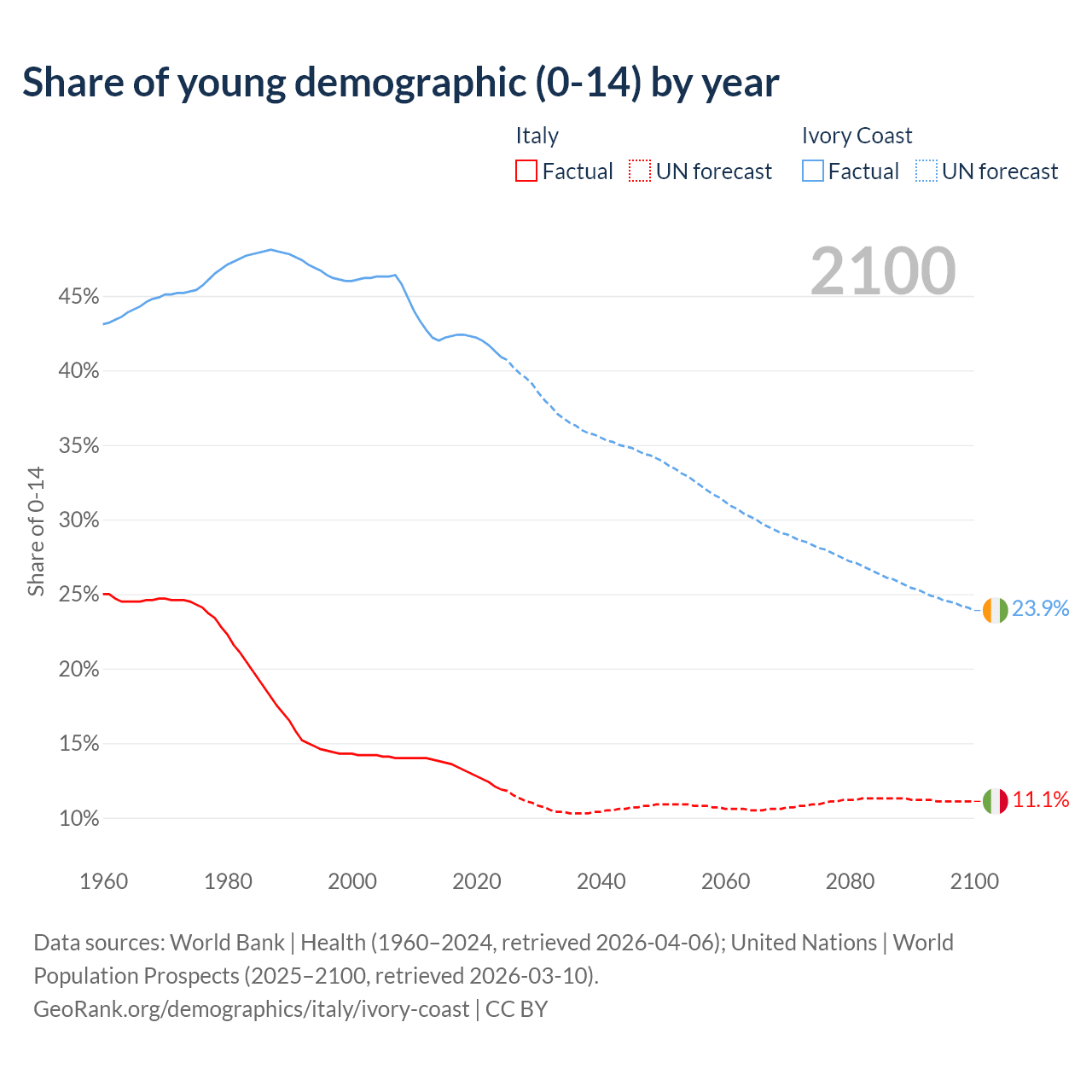 - The share of young demographic (0-15 years old) in Italy is 11.9% vs 40.9% in Ivory Coast.