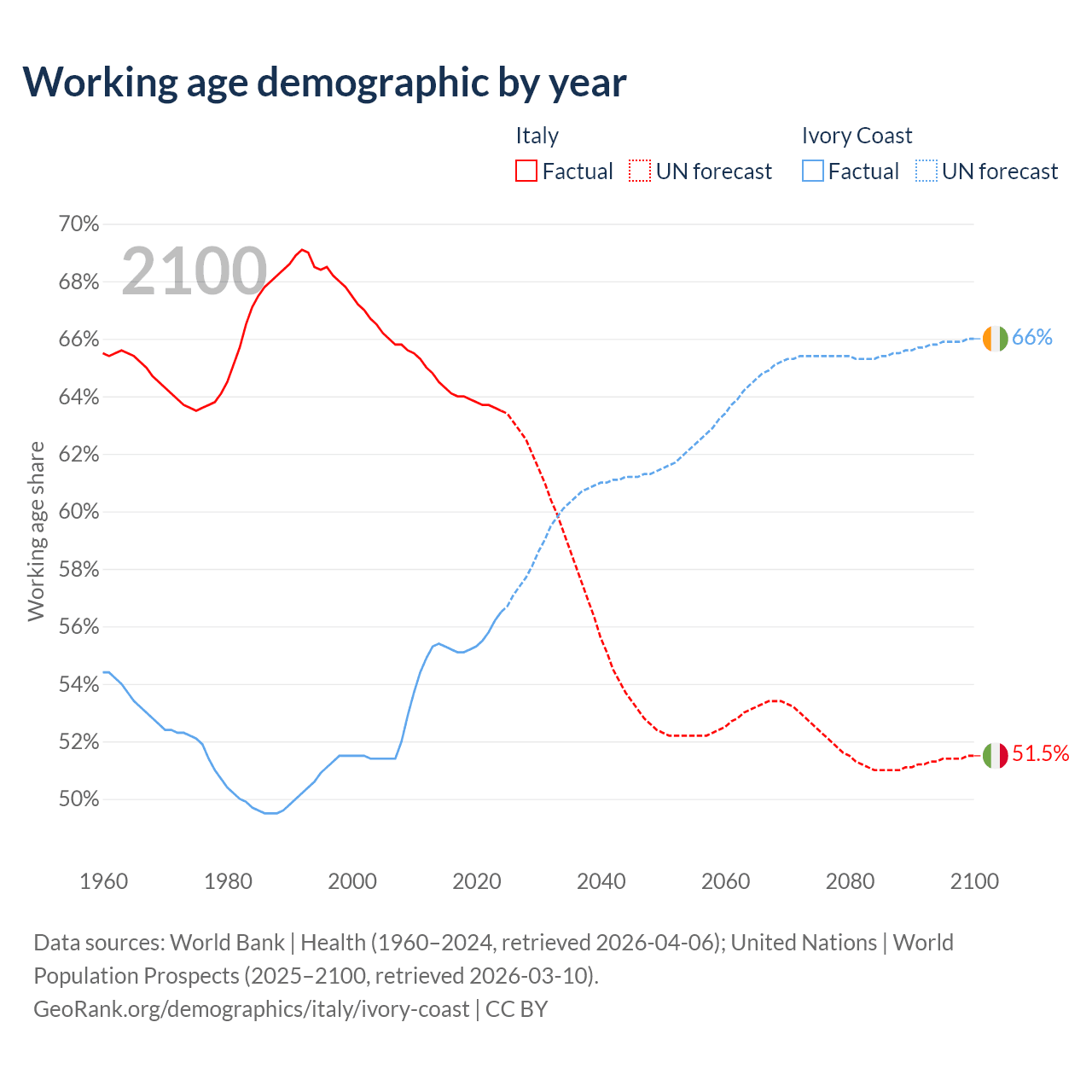 Median age Italy vs Ivory Coast, 1960-2100
