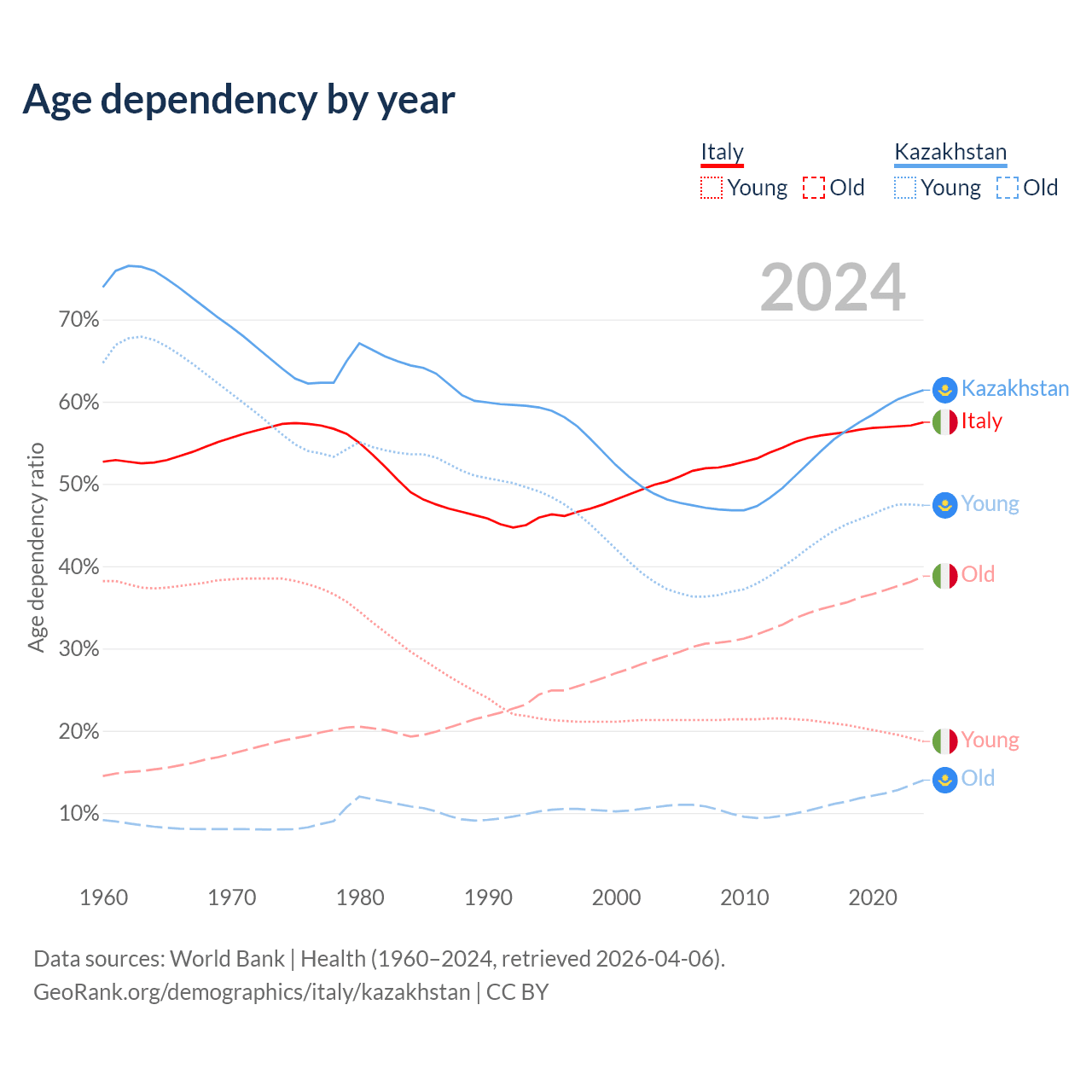 - Italy is ranked 4/196 by median age (oldest to youngest) vs 99/196 for Kazakhstan.