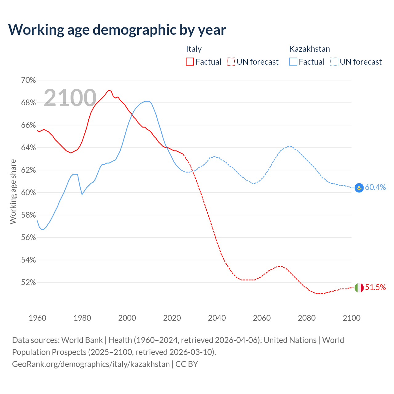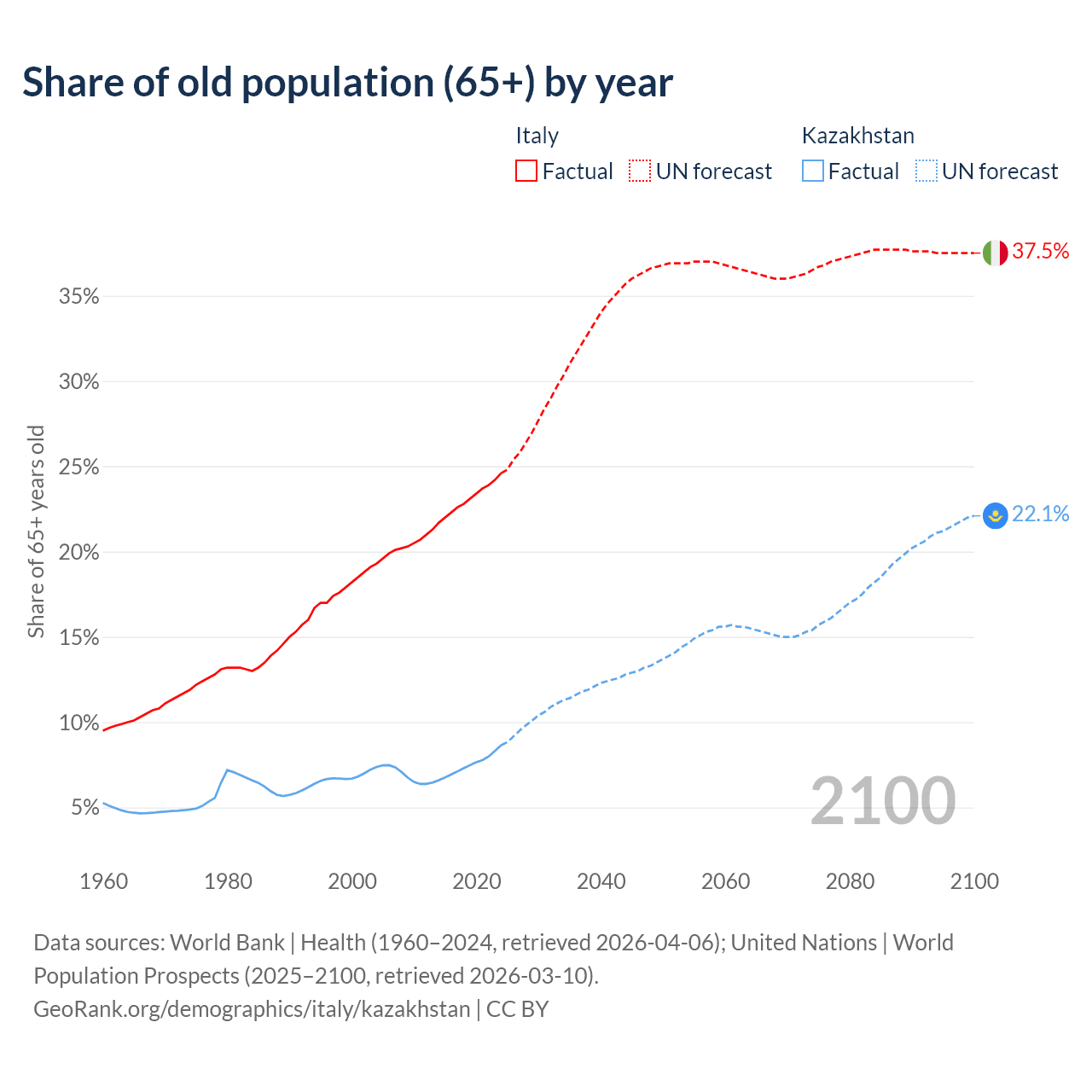 Median age Italy vs Kazakhstan, 1960-2100