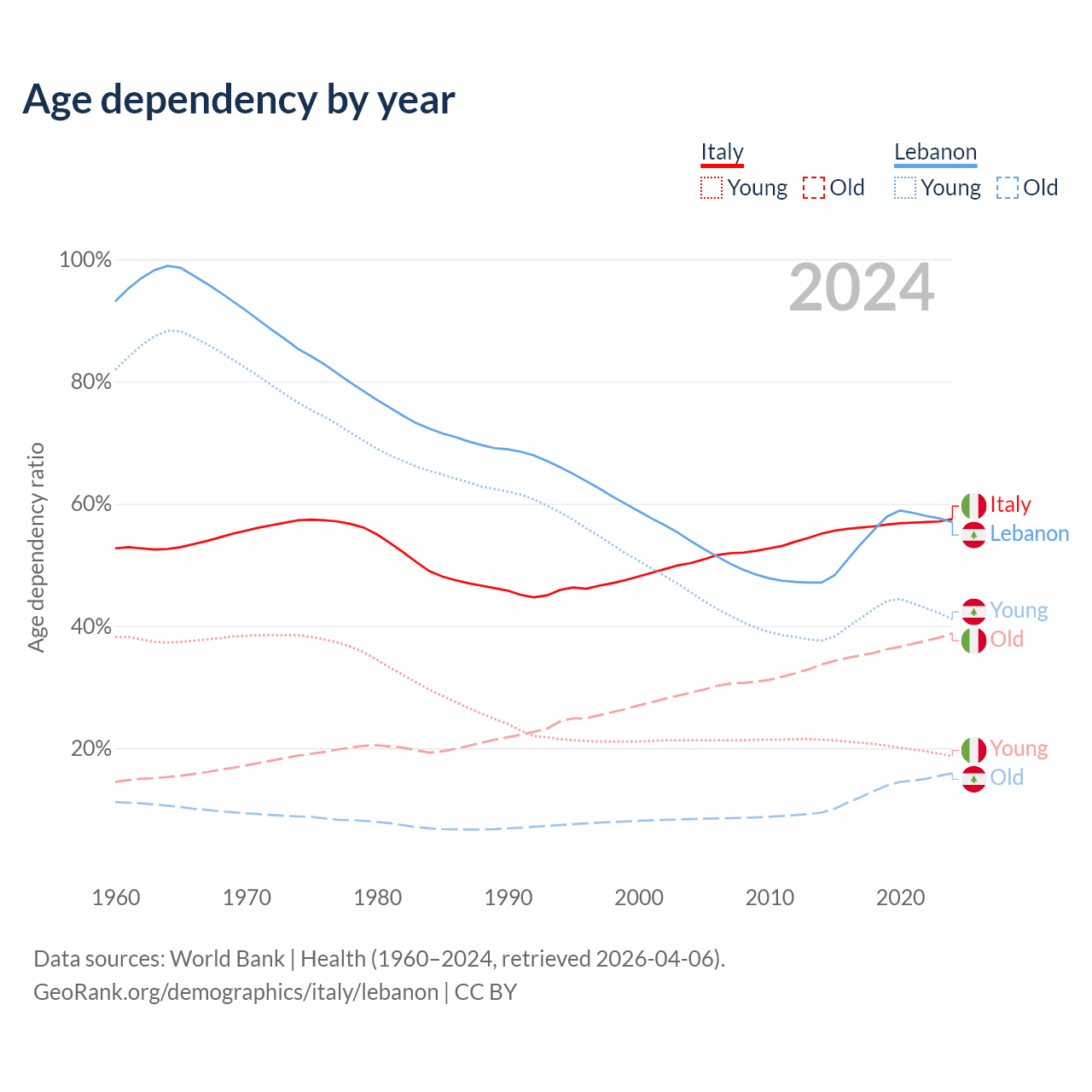 - Italy is ranked 4/196 by median age (oldest to youngest) vs 106/196 for Lebanon.