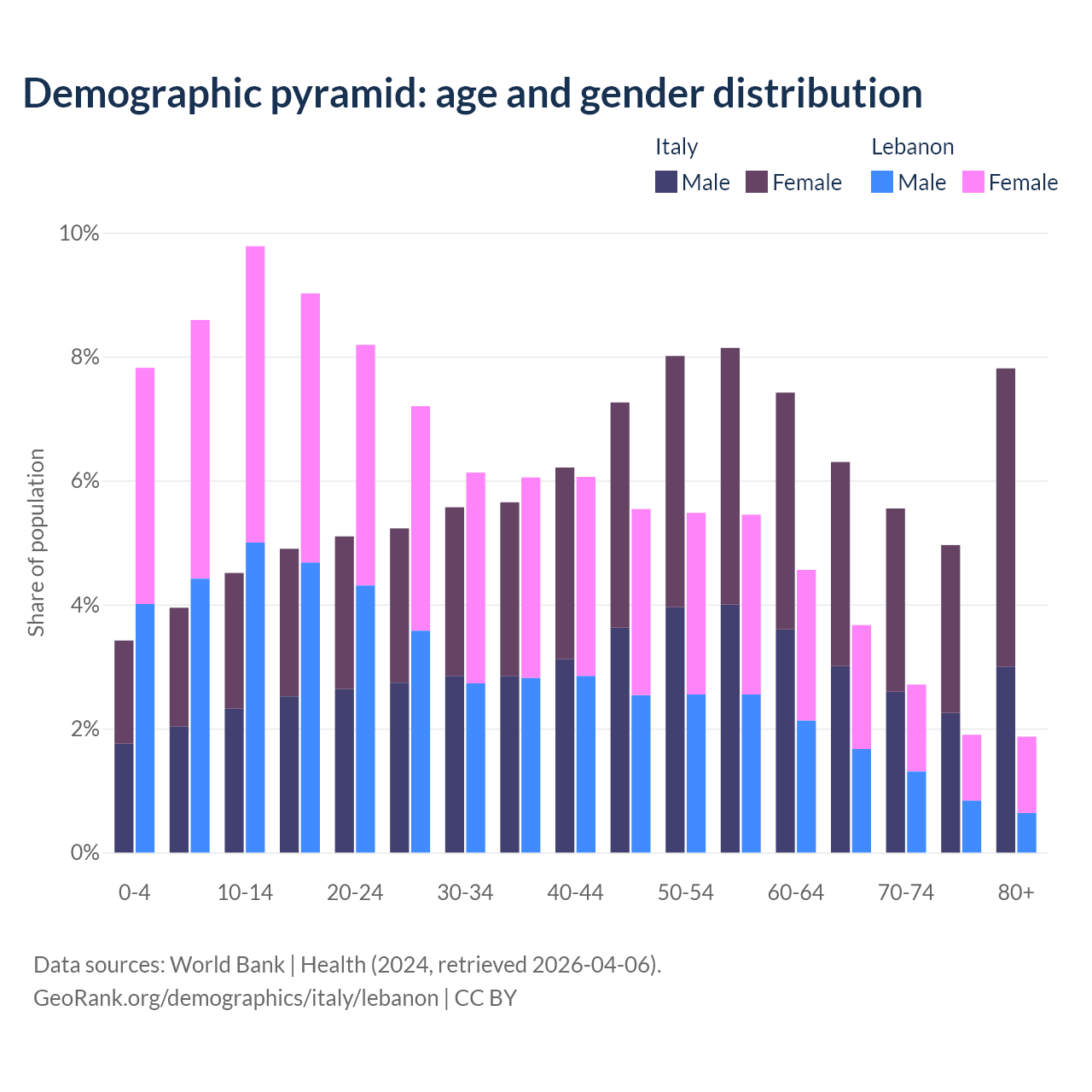 - As of 2026, the population of Italy is 58.6M vs 5.91M in Lebanon - 9.91 times difference.