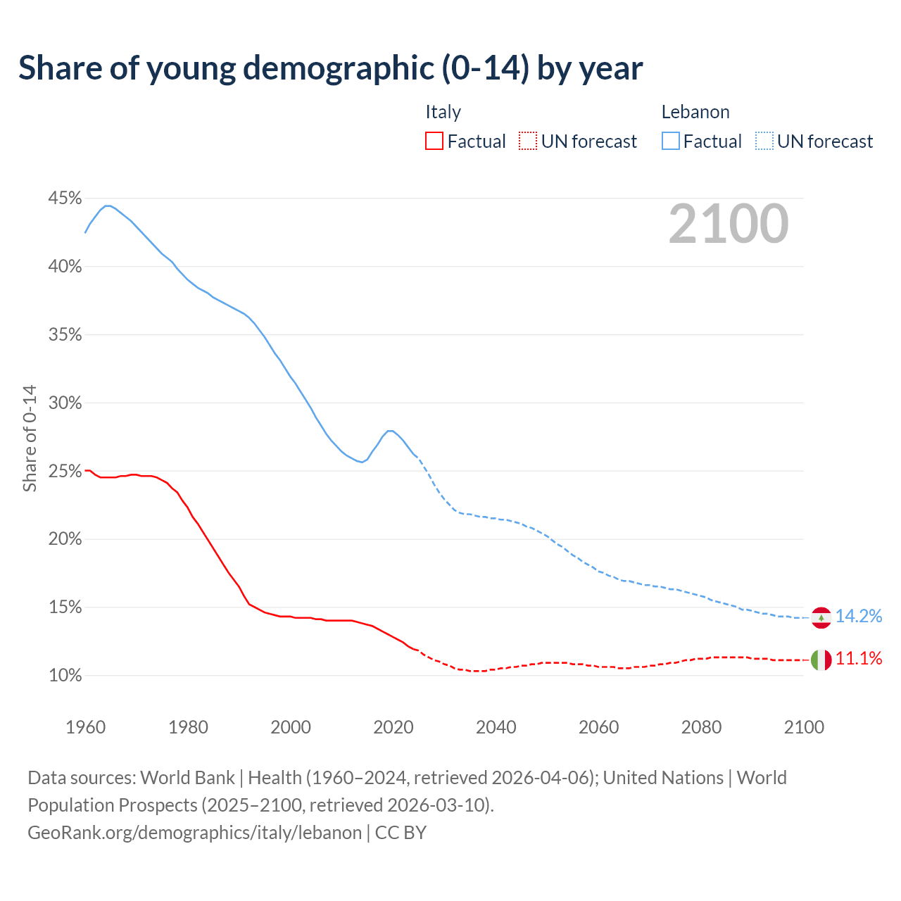 - The share of young demographic (0-15 years old) in Italy is 11.9% vs 26.2% in Lebanon.