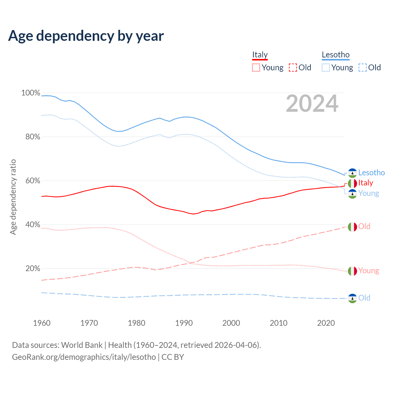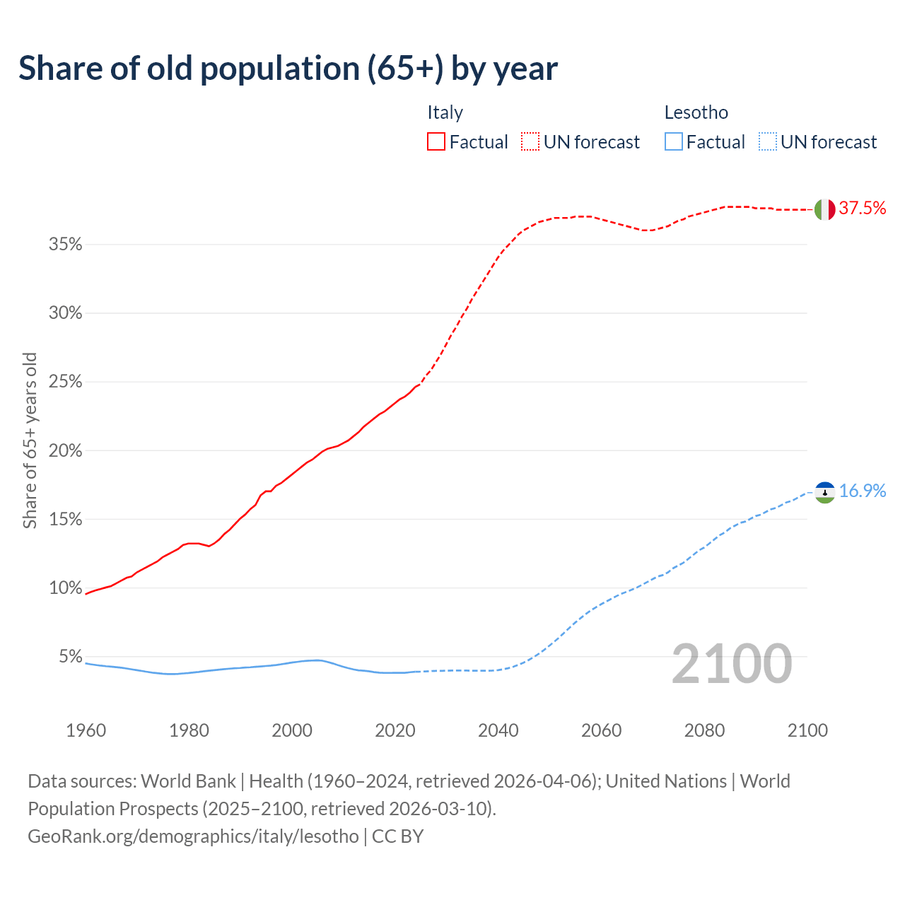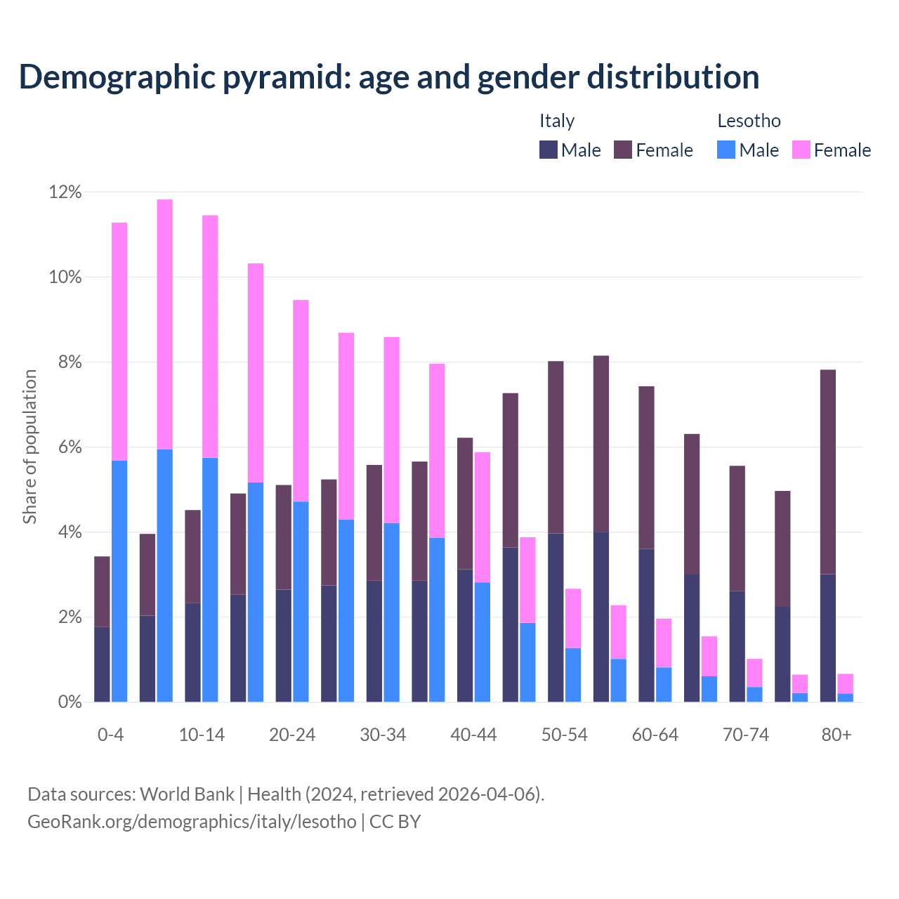 The share of older people aged 65 and over is 24.6% in Italy and 3.86% in Lesotho. Life expectancy in Italy compared to Lesotho .