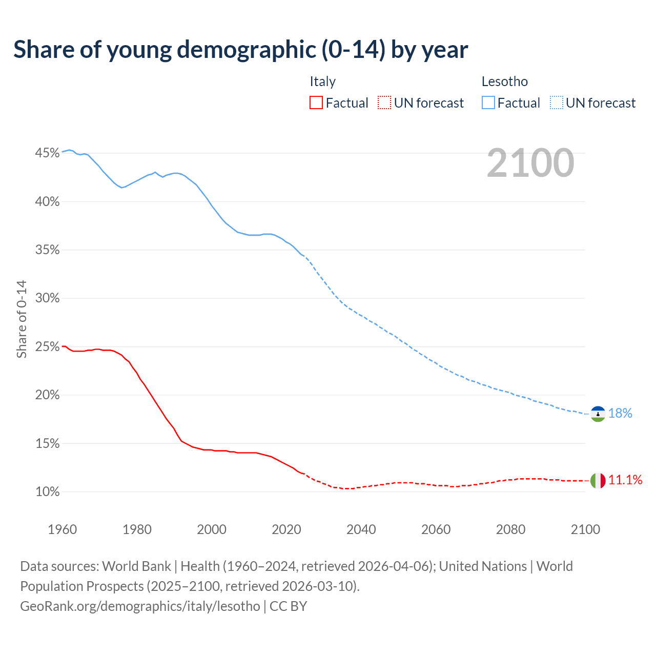 - The share of young demographic (0-15 years old) in Italy is 11.9% vs 34.5% in Lesotho.