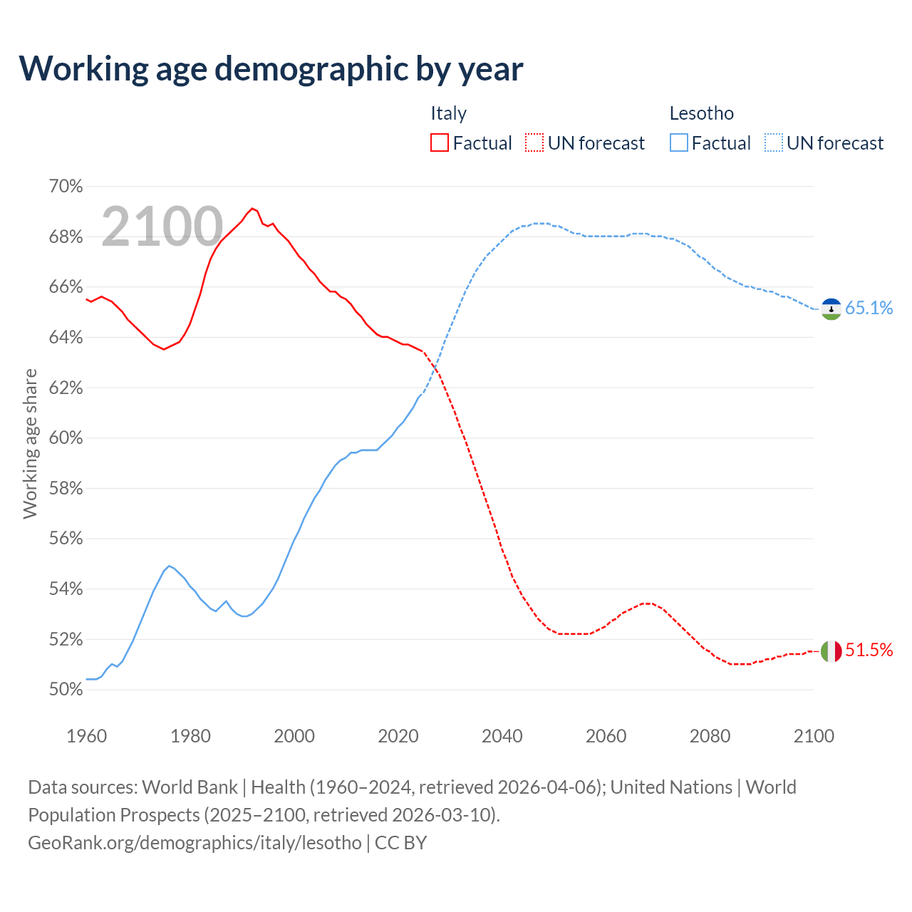 Median age Italy vs Lesotho, 1960-2100