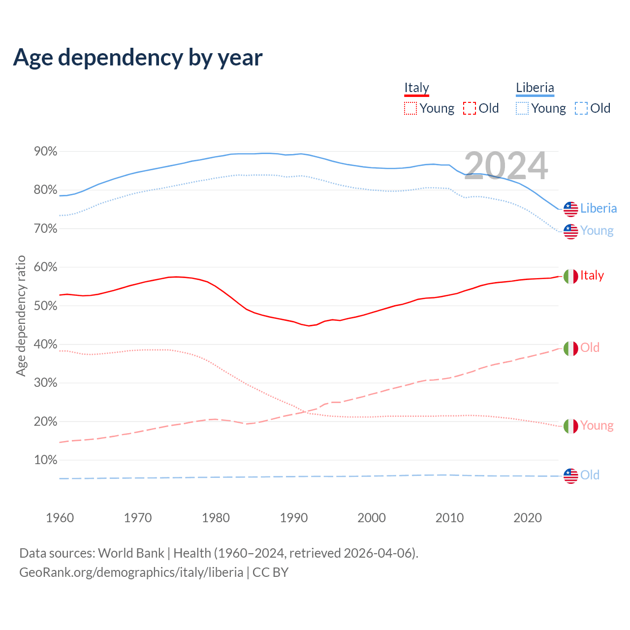 - The share of old-age demographic (65+) in Italy is 24.6% vs 3.3% in Liberia.
