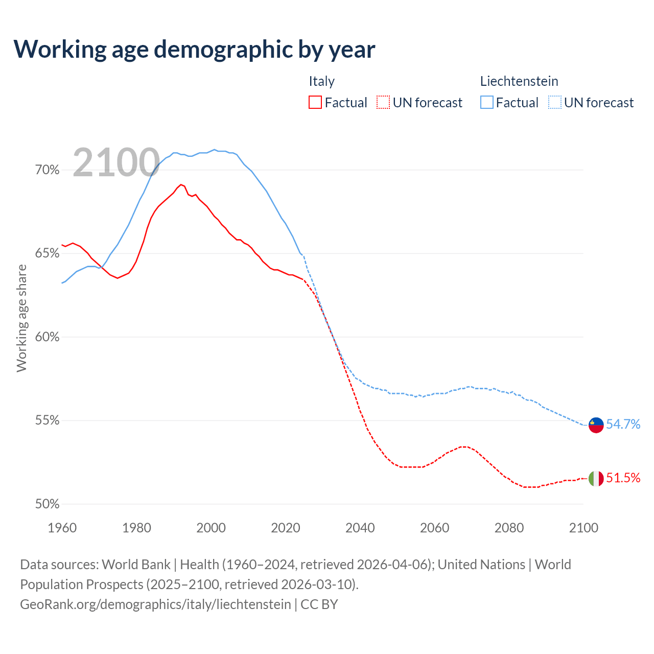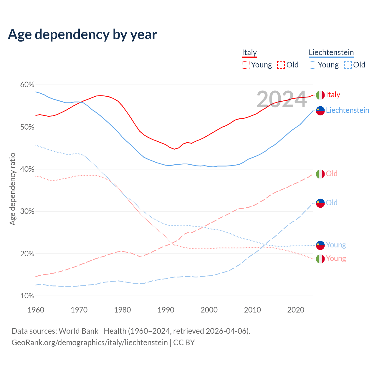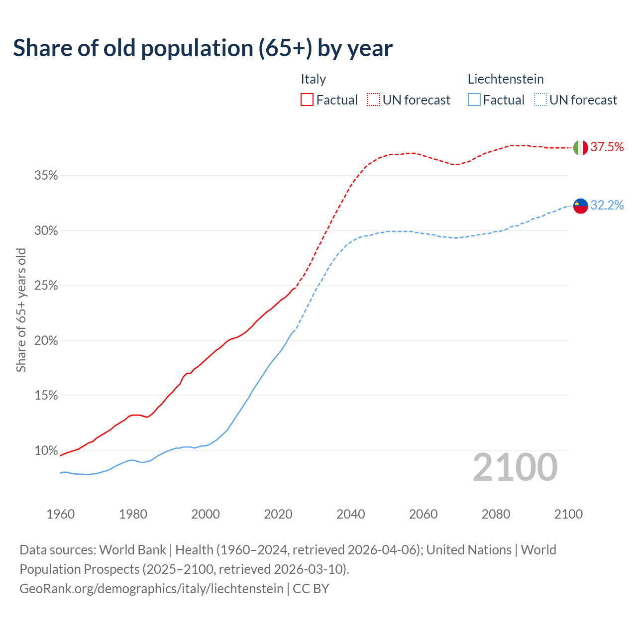 - The share of old-age demographic (65+) in Italy is 24.6% vs 20.7% in Liechtenstein.