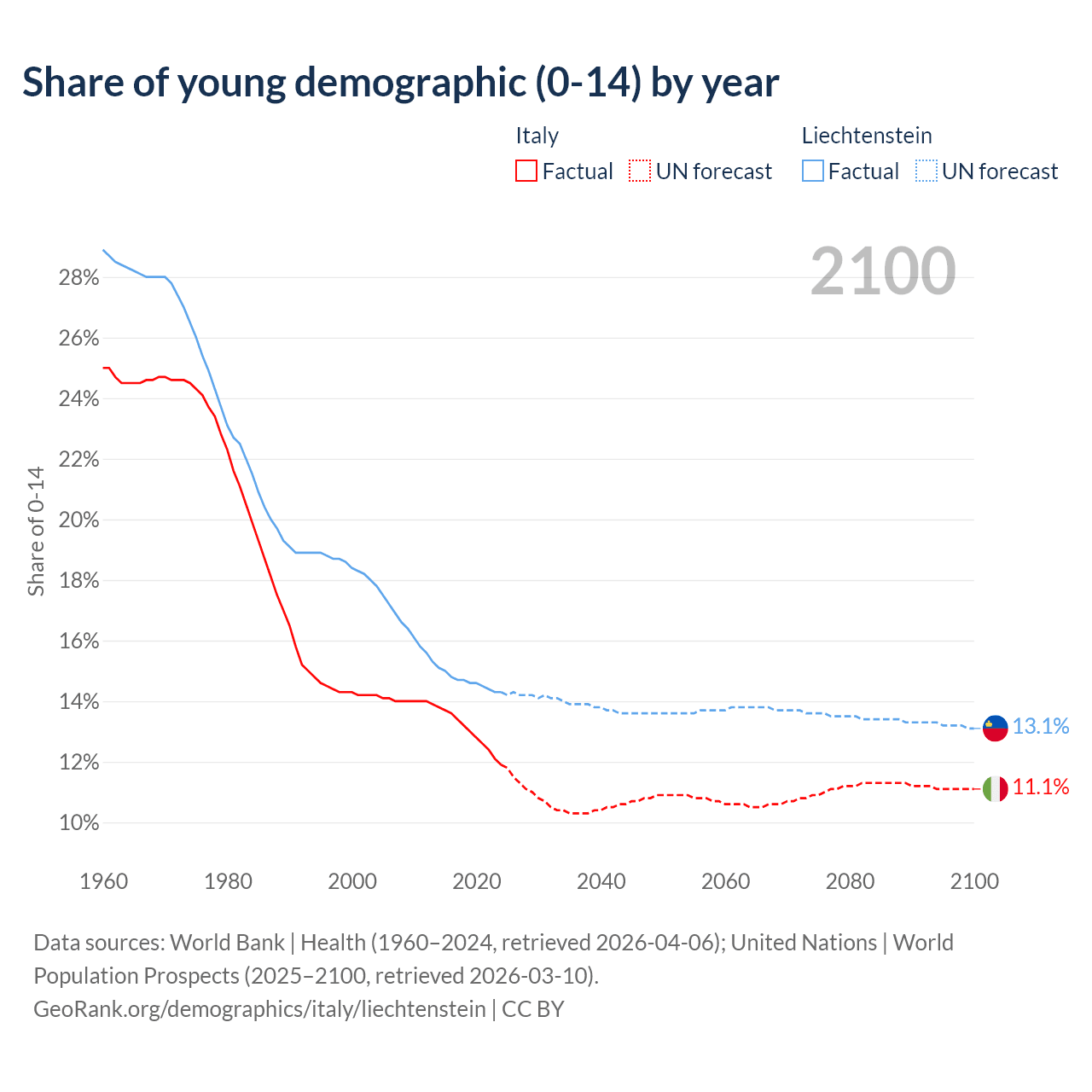 - The share of young demographic (0-15 years old) in Italy is 11.9% vs 14.3% in Liechtenstein.
