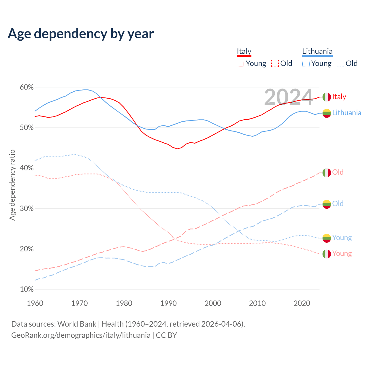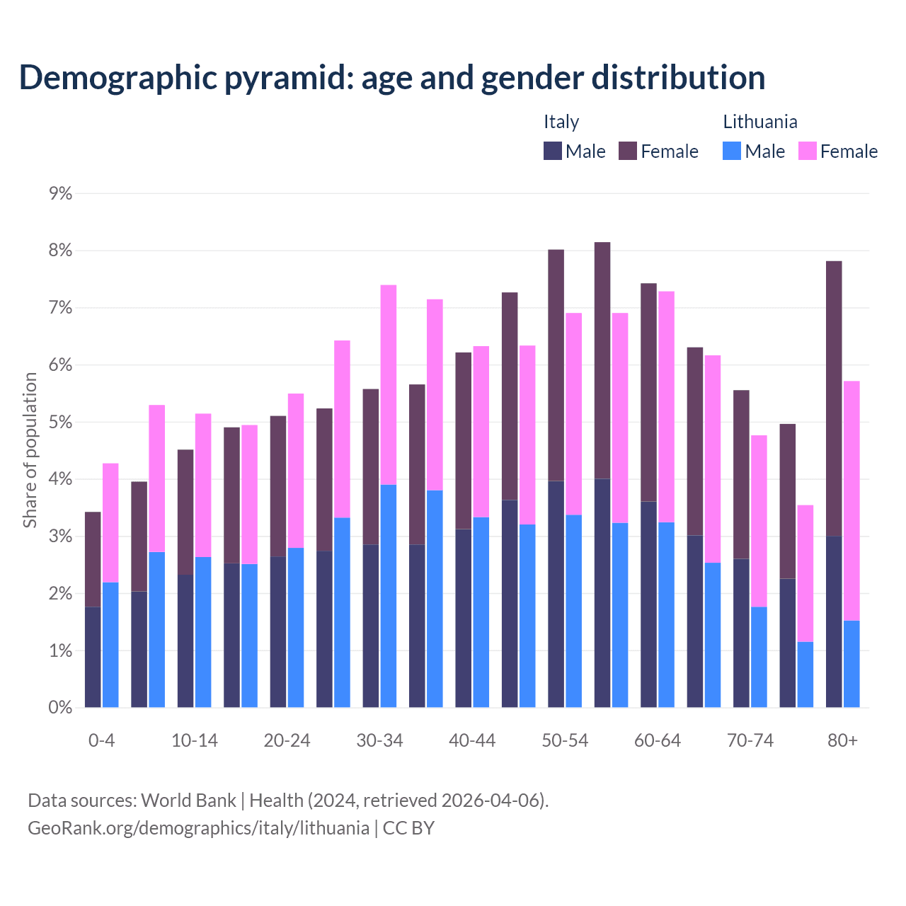 - Italy is ranked 4/196 by median age (oldest to youngest) vs 28/196 for Lithuania.