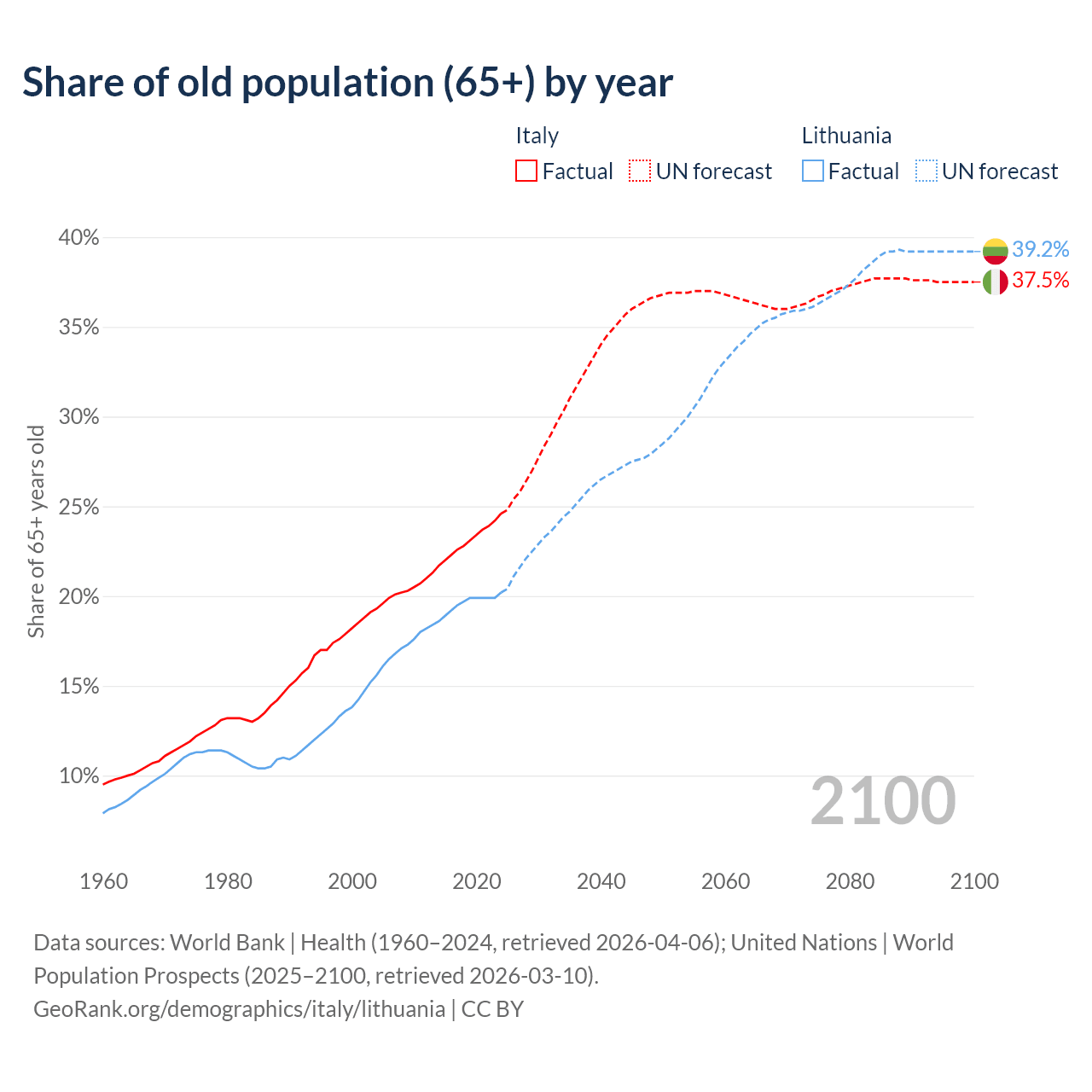 The share of older people aged 65 and over is 24.6% in Italy and 20.2% in Lithuania. Life expectancy in Italy compared to Lithuania .