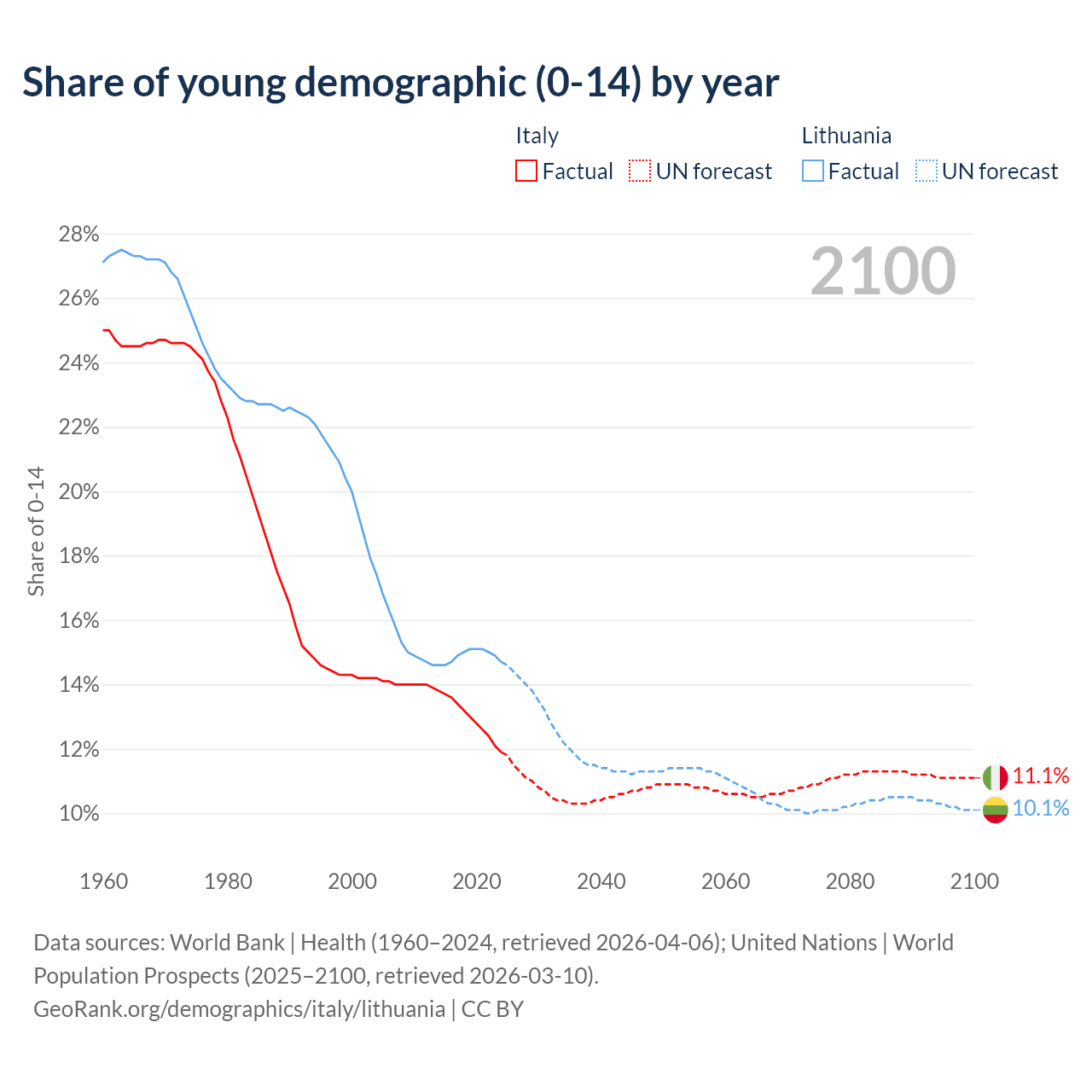 - The share of young demographic (0-15 years old) in Italy is 11.9% vs 14.7% in Lithuania.