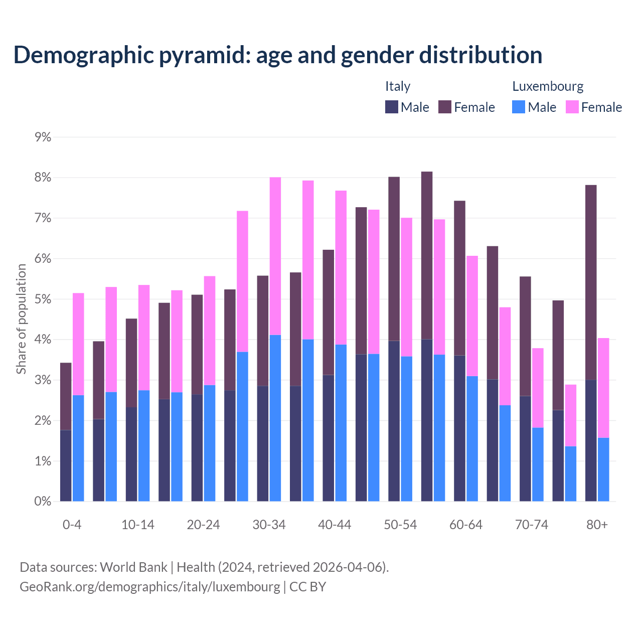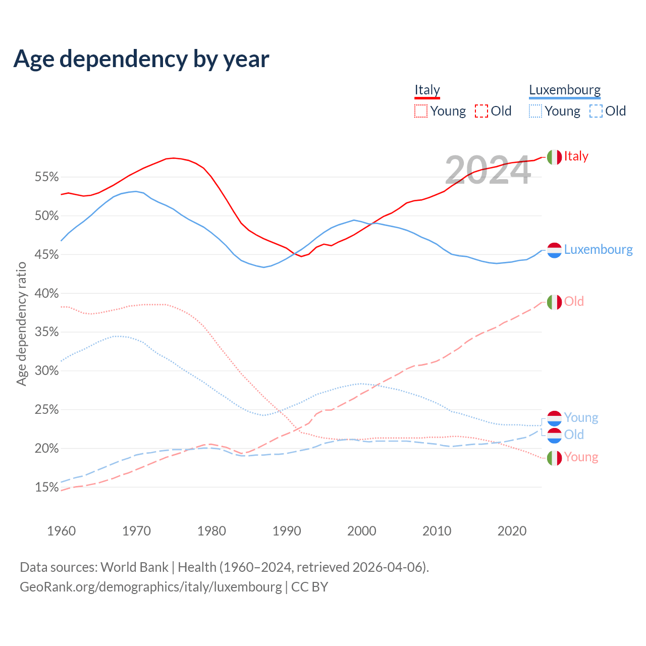 - Italy is ranked 4/196 by median age (oldest to youngest) vs 46/196 for Luxembourg.