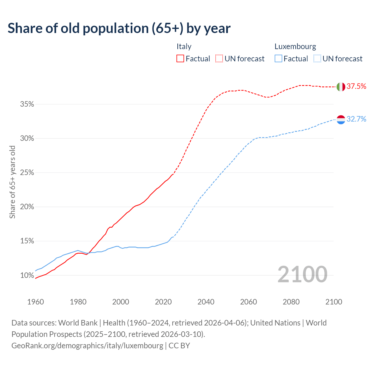 - The share of old-age demographic (65+) in Italy is 24.6% vs 15.5% in Luxembourg.