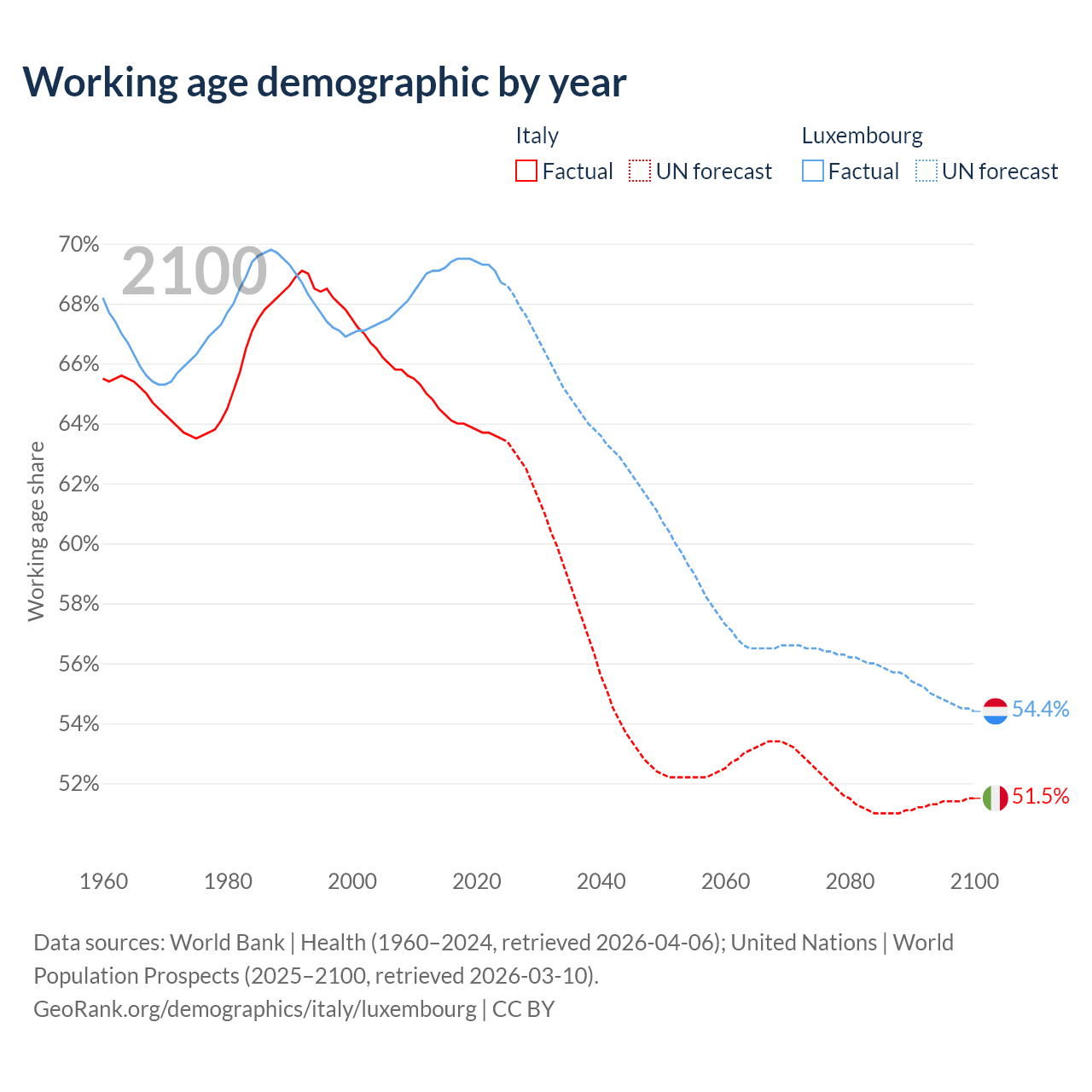 - Italy has 37.2M working age adults (aged 15-64) vs 477K in Luxembourg.