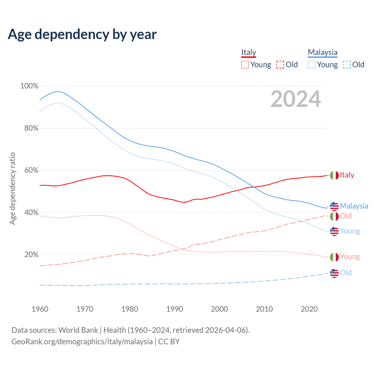 - Italy is ranked 4/196 by median age (oldest to youngest) vs 92/196 for Malaysia.