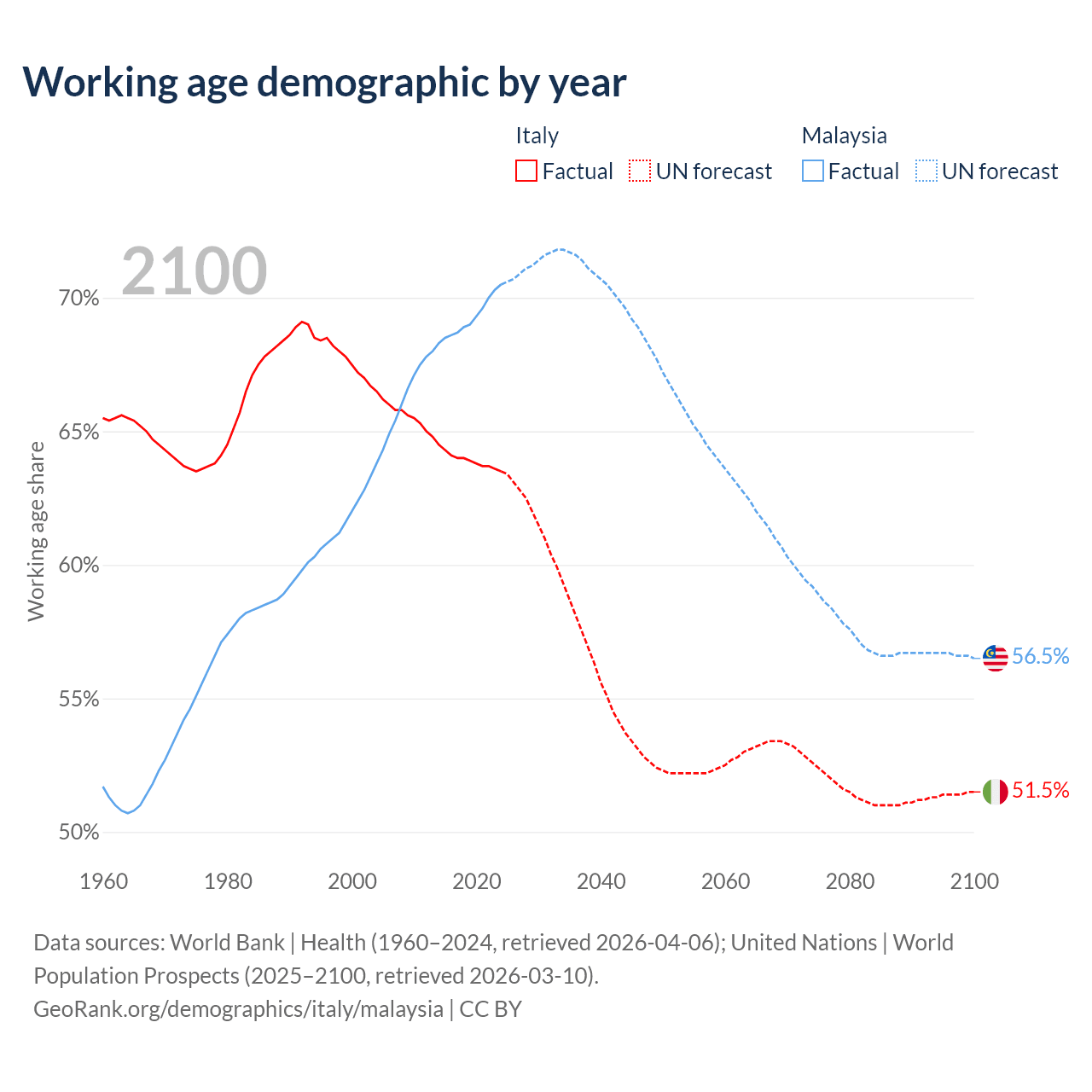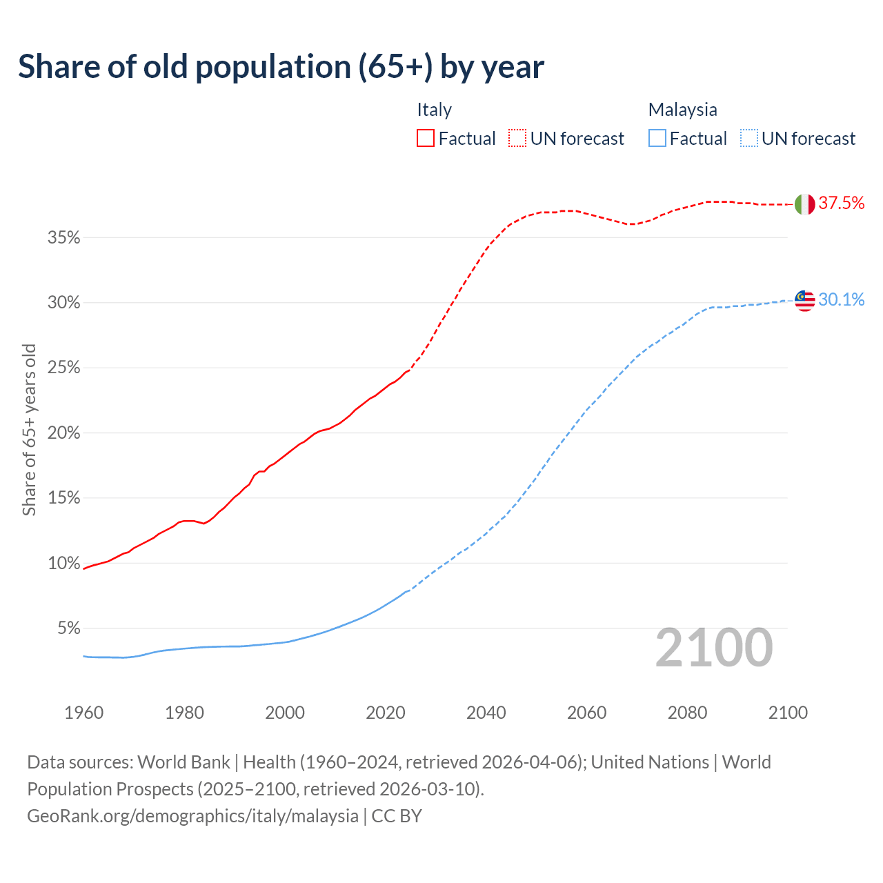 Median age Italy vs Malaysia, 1960-2100