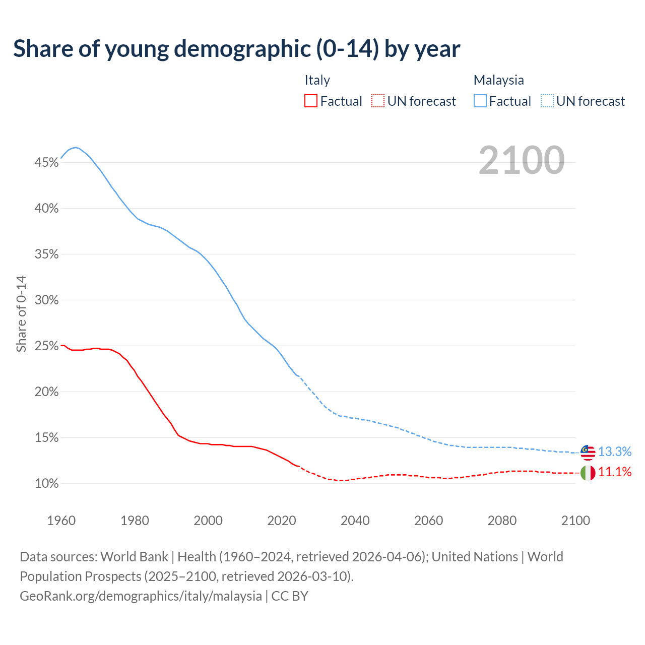 - The share of young demographic (0-15 years old) in Italy is 11.9% vs 21.8% in Malaysia.