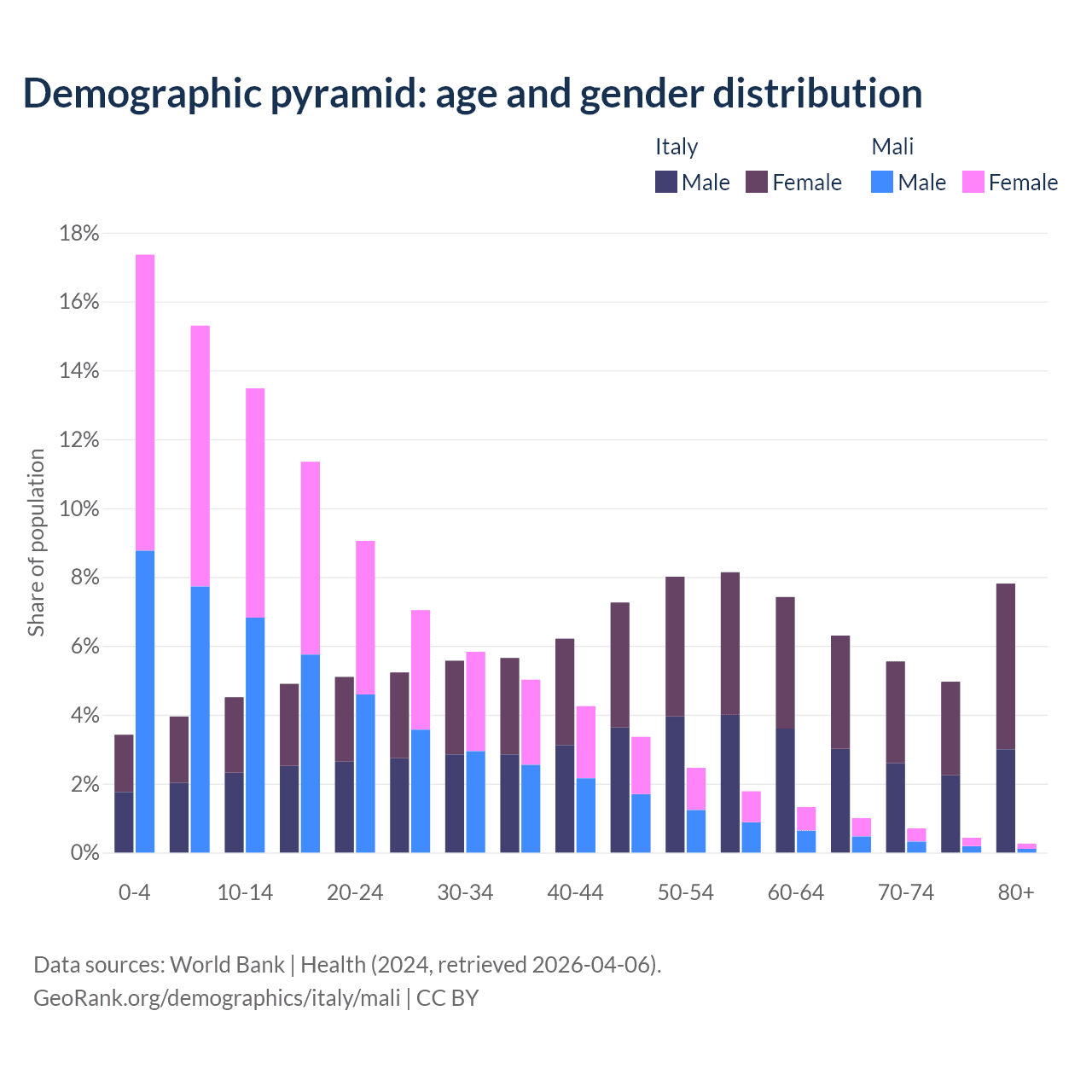 - As of 2026, the population of Italy is 58.6M vs 26.1M in Mali - 2.24 times difference.