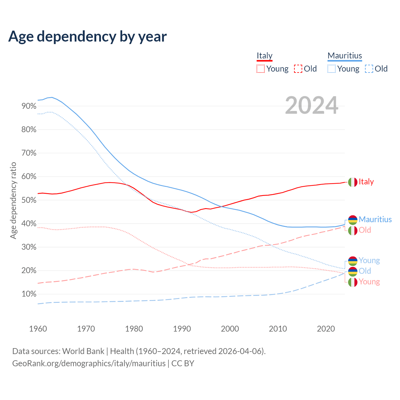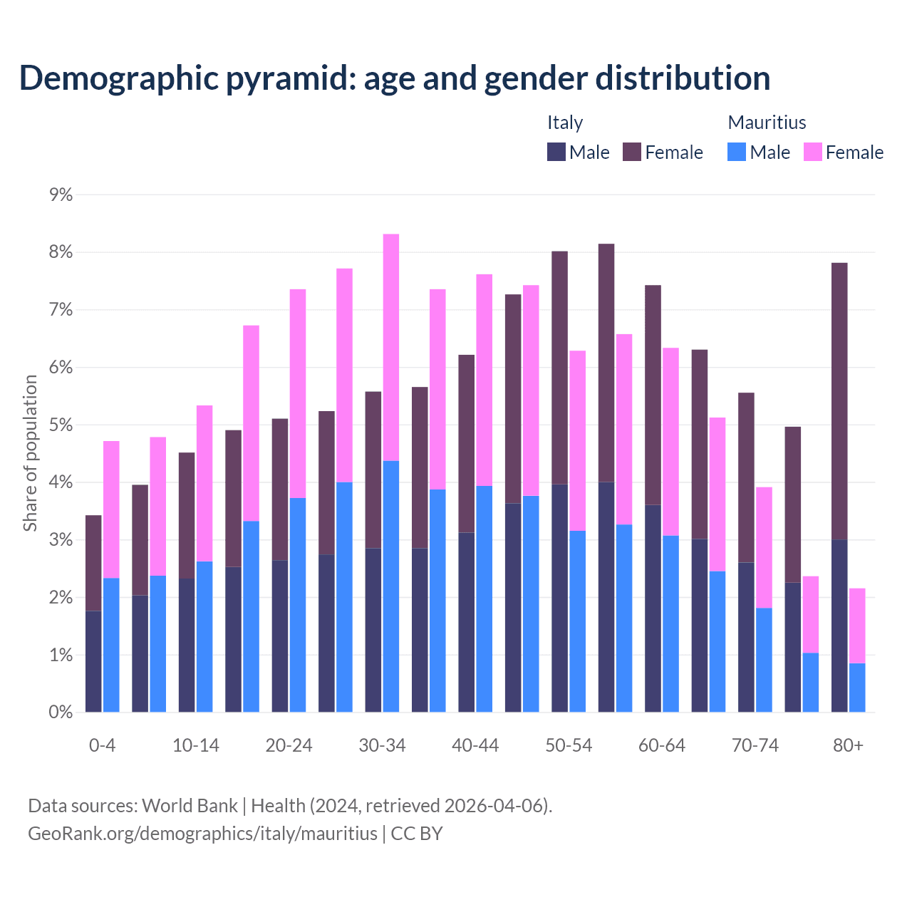 The share of older people aged 65 and over is 24.6% in Italy and 13.5% in Mauritius. Life expectancy in Italy compared to Mauritius .