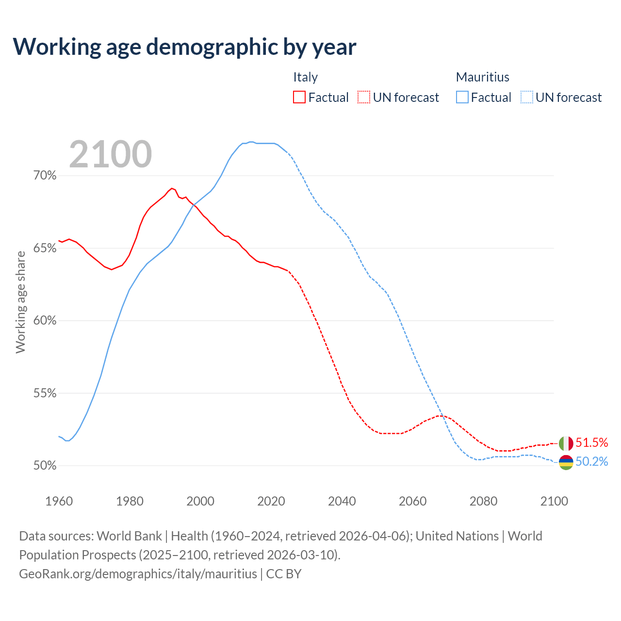 - Italy has 37.2M working age adults (aged 15-64) vs 889K in Mauritius.