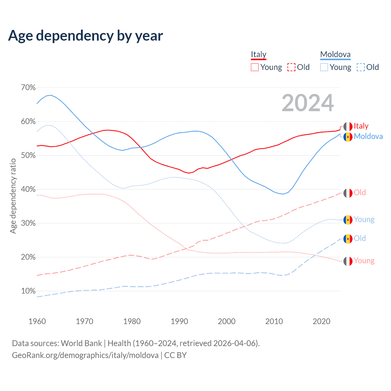 - The share of old-age demographic (65+) in Italy is 24.6% vs 16.2% in Moldova.