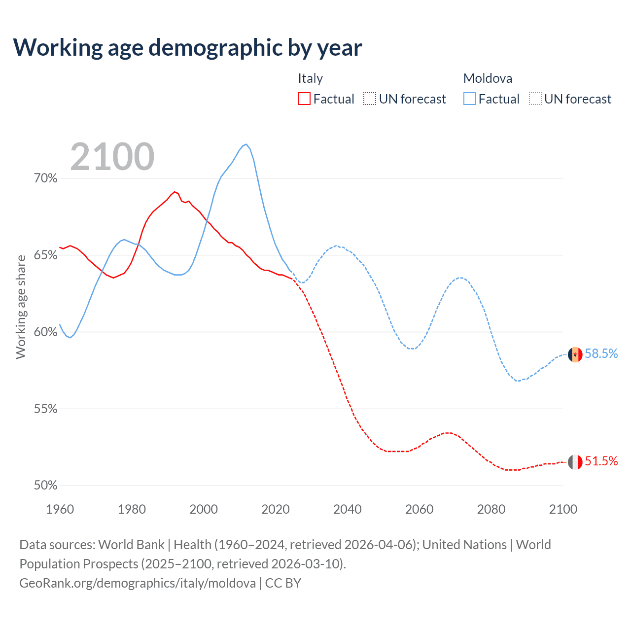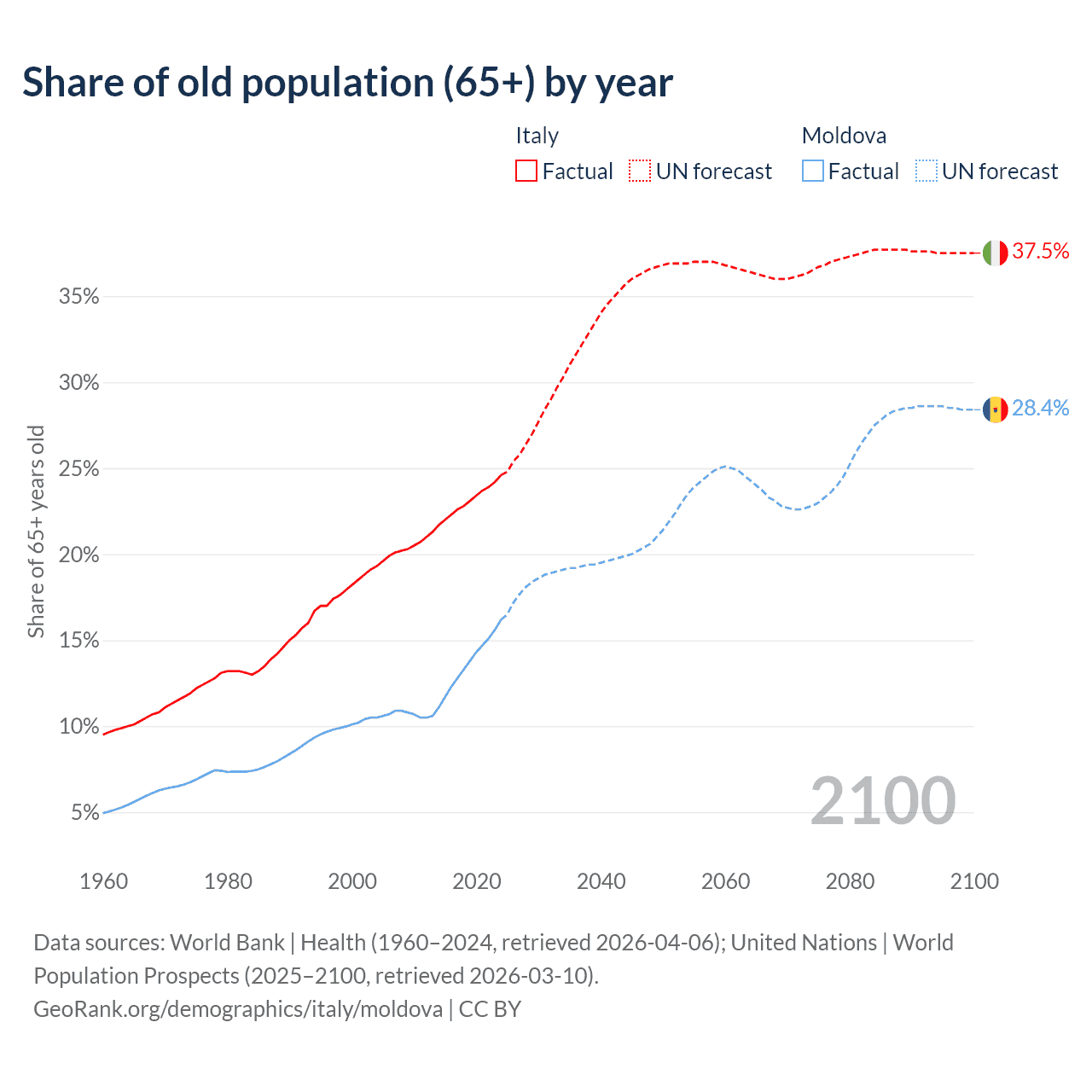 Median age Italy vs Moldova, 1960-2100
