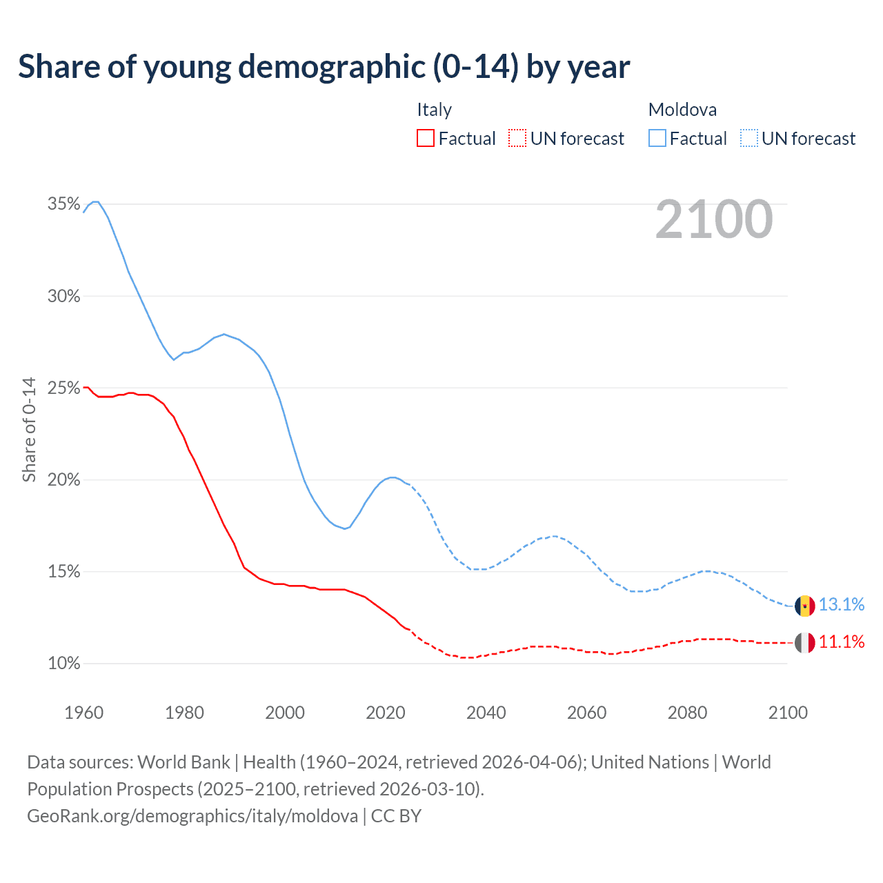 - The share of young demographic (0-15 years old) in Italy is 11.9% vs 19.8% in Moldova.