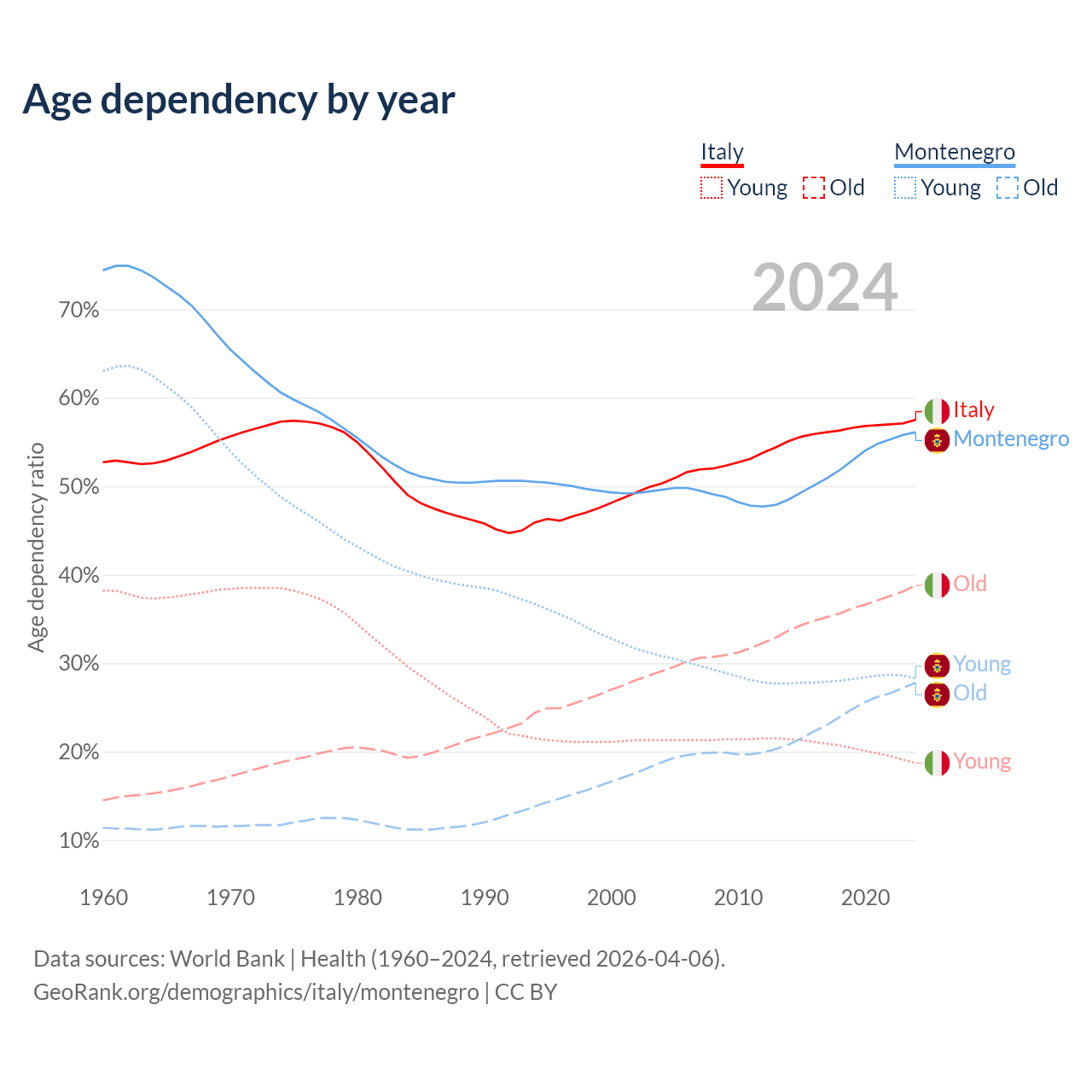 - Italy is ranked 4/196 by median age (oldest to youngest) vs 45/196 for Montenegro.