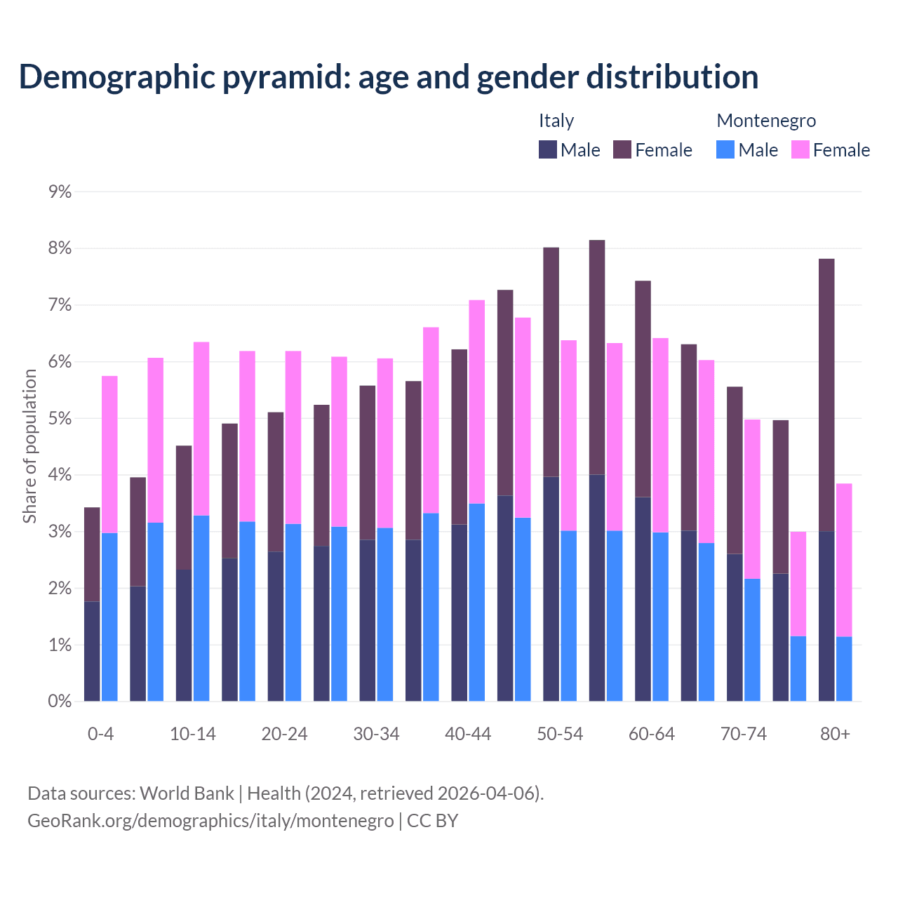 - As of 2026, the population of Italy is 58.6M vs 612K in Montenegro - 95.6 times difference.