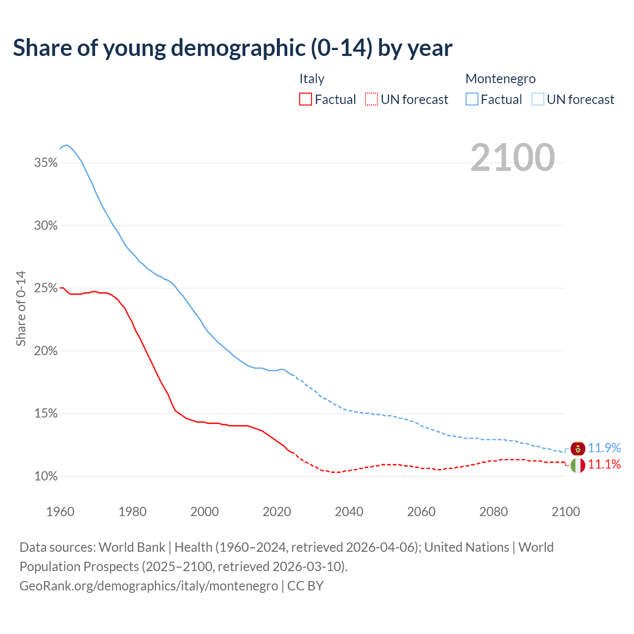 - The share of young demographic (0-15 years old) in Italy is 11.9% vs 18.1% in Montenegro.
