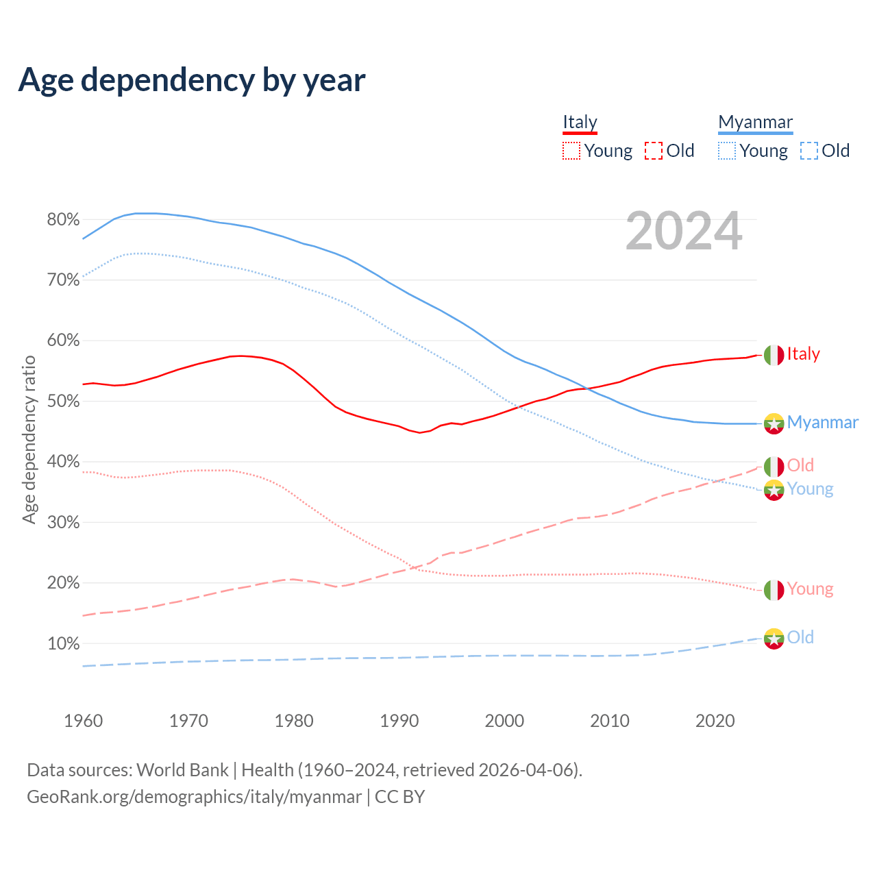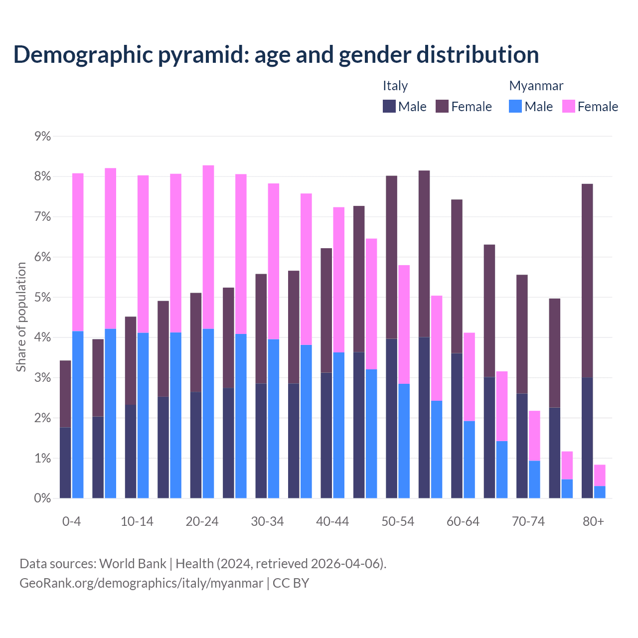 - Italy is ranked 4/196 by median age (oldest to youngest) vs 96/196 for Myanmar.