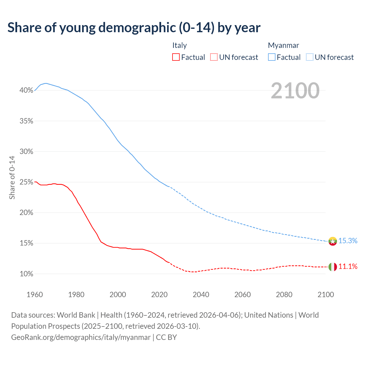 - The share of young demographic (0-15 years old) in Italy is 11.9% vs 24.3% in Myanmar.