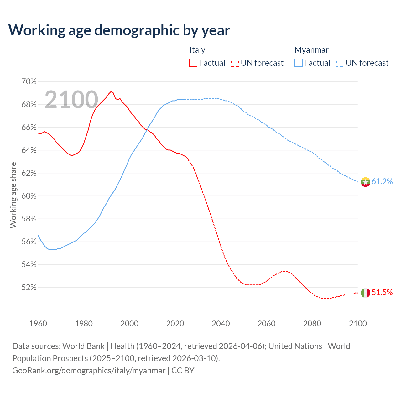 - Italy has 37.2M working age adults (aged 15-64) vs 37.8M in Myanmar.
